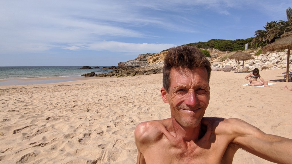 When preparing for this trip, I looked at GoogleEarth and selected about fifteen beaches to visit and check out. By the way, GoogleEarth is a great tool for planning trips, because people put a lot of pictures and comments on places they have visited. Anyway, after three days of going from beach to beach, here are my three absolute favorits. One was Praia da Ingrina which is very close to Sagres and Cabo de Sao Vincente. A perfectly protected from wind and waves bay with shallow waters: very calm and the water temperature was noticeably warmer than in other places. Combined with nice sand beach, this is a great place for families with kids: very safe place to swim. Here it is: