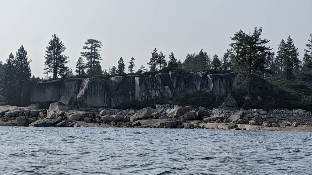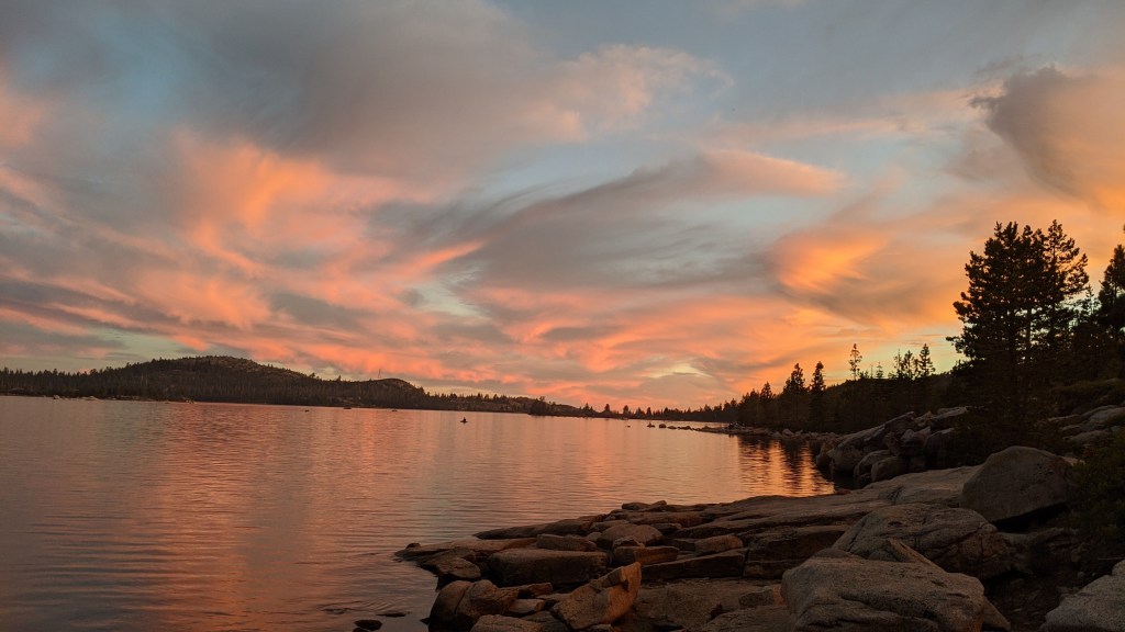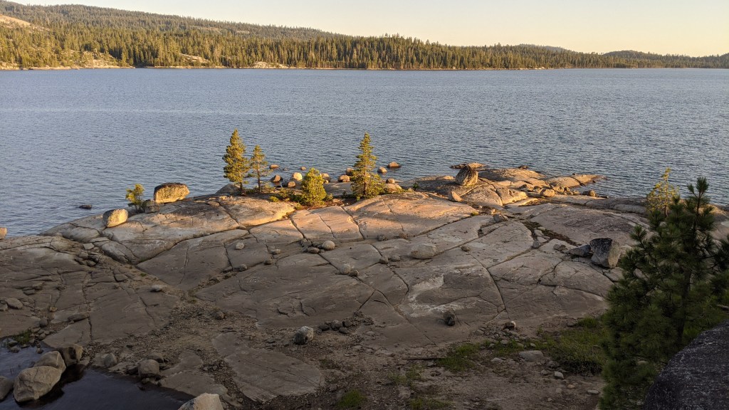 Landscapes surrounding Loon Lake are austere: grey granite formations, pine forest, mountains dotted with snow even in late summer