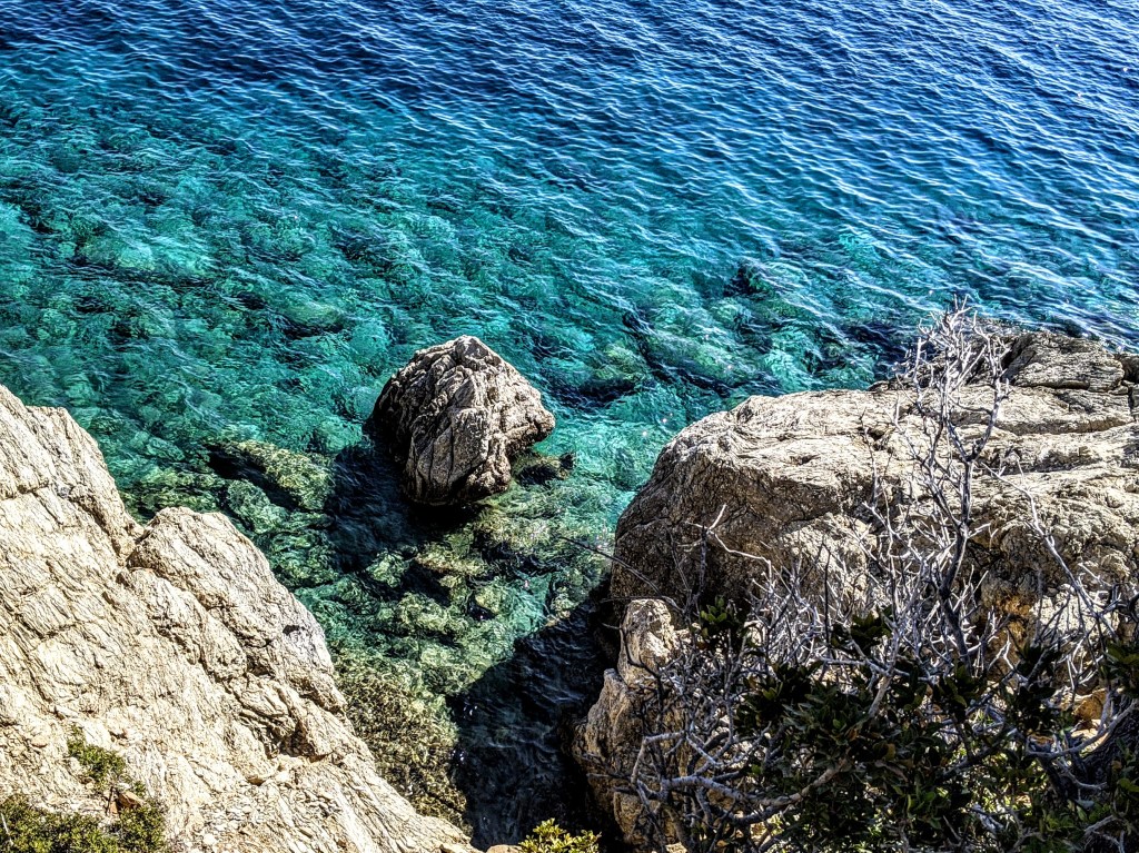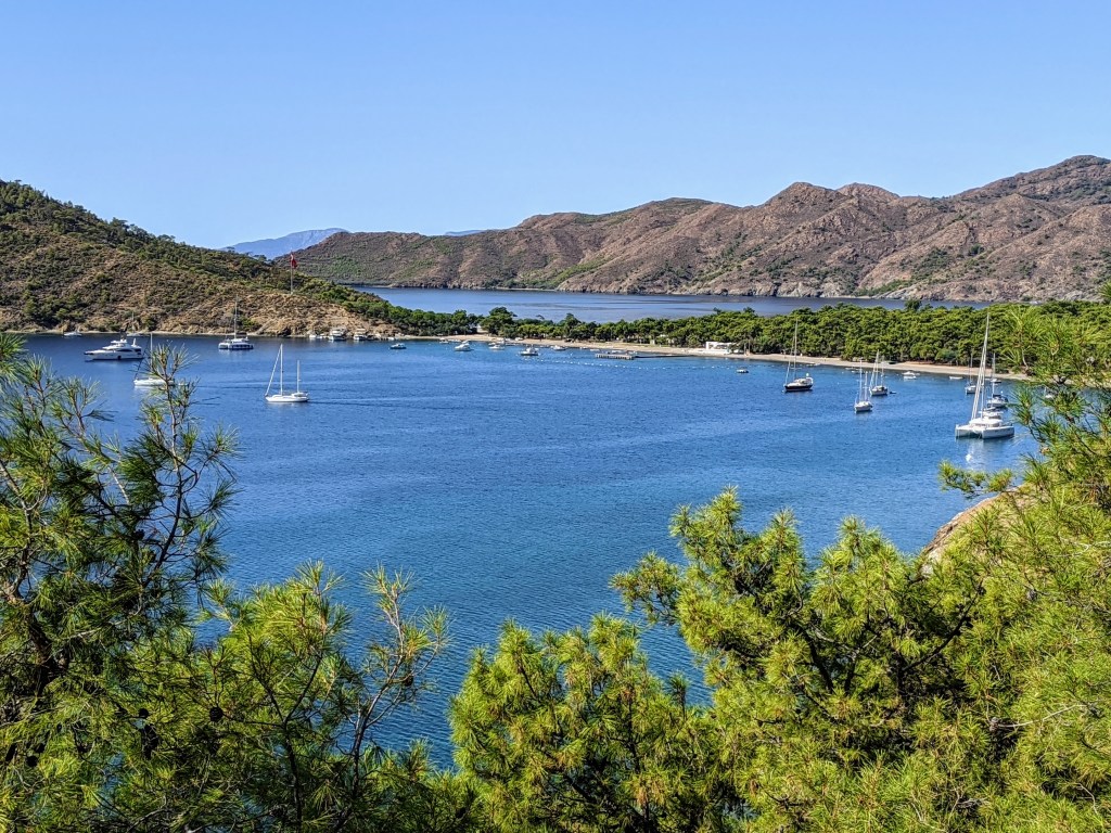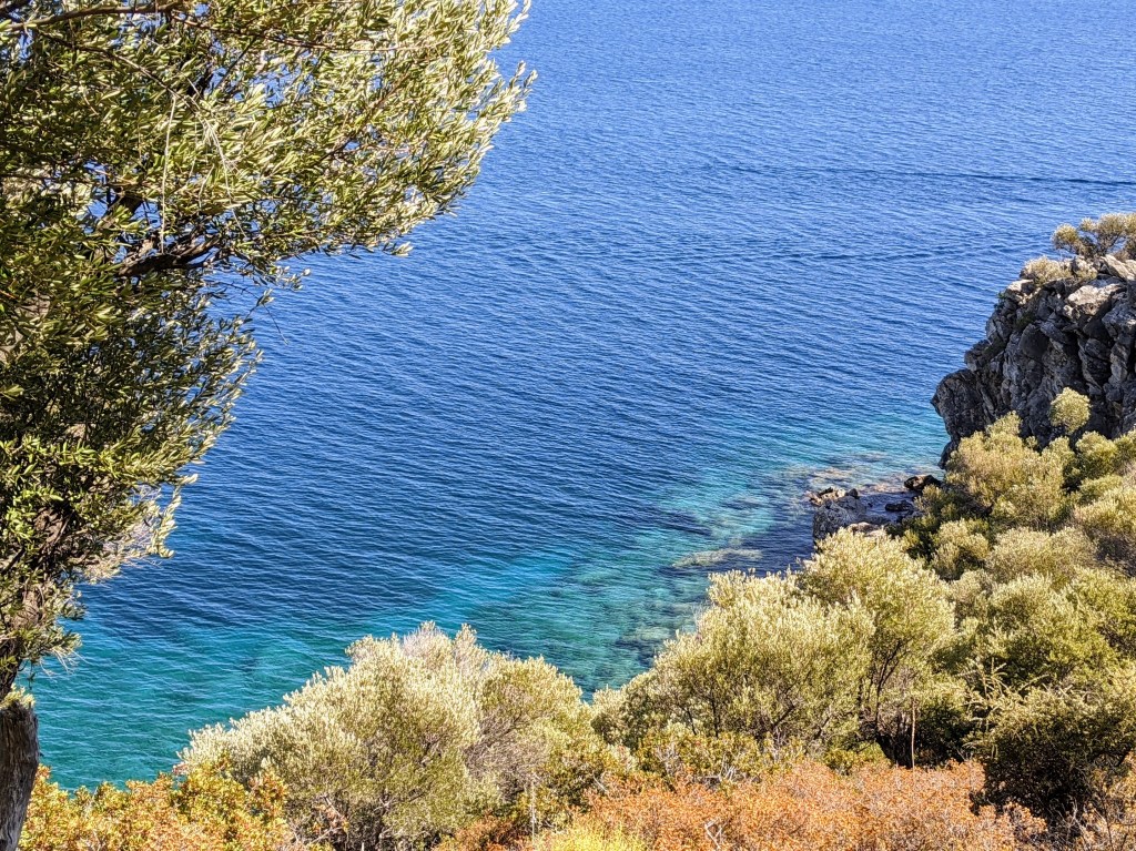 Most visitors to Datca go to visit Knidos – the ruins of an ancient Greek city situated at the very tip of Datca peninsula, exactly at the “meeting point” of Aegean and Mediterranean seas. It is, indeed, an impressive archeological site. But it would have taken a good part of our only one day in Datca and, therefore, we decided to skip Knidos. Instead, we hiked to Aquarium beach (Akvaryum Koyu in Turkish). Aquarium beach is located in pristine, well protected (from waves) and difficult to reach cove. The easiest way to get there is by boat and in summer time many local tourist operators bring there visitors to enjoy the scenery, swimming and sunbathing. We visited Datca in early October and the tourist season was over. So, how to get to Akvaryum Koyu without a boat? We drove to Cennetkoy Beach and Restaurant. From there, a narrow and rocky path will first take you up the hill, then it will zigzag along coastal line, and finally it will “drop” into Aquarium Beach. The path is not well marked and initially we took a wrong turn and hiked about 40 min. in wrong direction. But…who cares, when the air smells of pine forest and the scenery is like this: