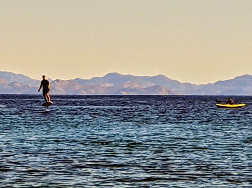 Despite the size of the boat (and obviously some crew onboard), only two persons appeared and “descended” into the sea: a woman (in yellow kayak ) and a man. And then…I have never seen such a “device” before: it looked like a surfboard, but with some sort of powerful motor which kept the man literally flying above the sea.