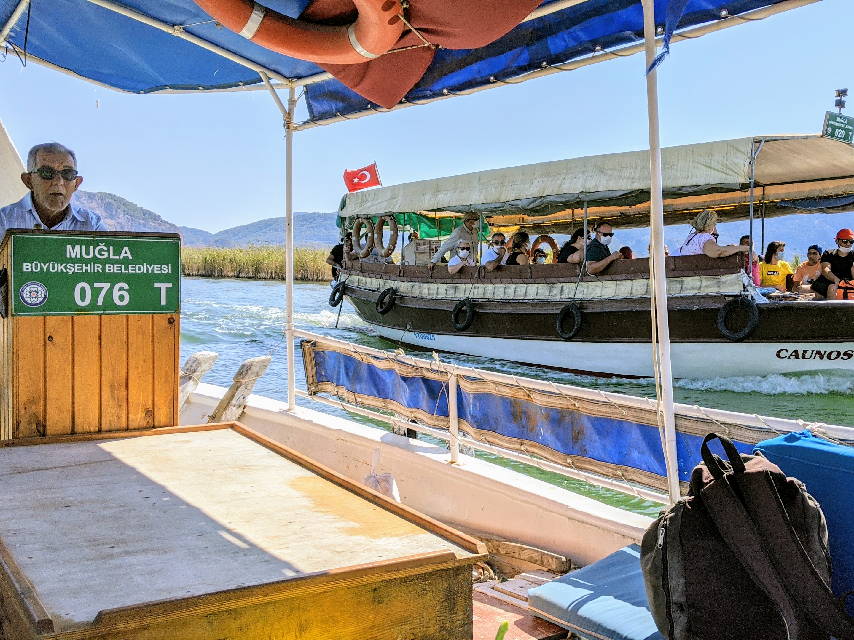 After Datca peninsula, our next destination was Kabak Valley – a great place on the coast, south of Fethiye and Oludeniz: a bit later I will tell more about Kabak Valley. But first and en route we decided to visit Dalyan – the coastal town in Mugla province, between Marmaris and Fethiye. Dalyan attracts plenty of tourists and there are at least three reasons for this. The first is Iztuzu beach – a narrow and long (4.5 km) spit of land, which forms a natural barrier between the fresh water delta of the Dalyan river and Mediterranea sea. Hence, when visiting the beach, you can take a nice swim in both salt and fresh water. But the most important thing about Iztuzu beach is that it is one of the main breeding grounds for loggerhead sea turtles (Caretta caretta). Therefore, it is also often referred to as Turtle Beach. The second reason to visit Dalyan are the ruins of the ancient trading city of Kaunos and Lycian tombs dating back to circa 400 BC. Their facades are cut into the sheer cliffs above Dalyan river which is the third reason to visit Dalyan. Indeed, the river flows through the town and then splits into many channels surrounded by swamps and forming the river’s delta. Taking a small ferry boat from Dalyan is the best way to check out all three major attractions: to visit Iztuzu beach, to see the facades of the tombs and simply enjoy the ride through the swamps and channels. We decided to splurge and, instead of going with the group of other tourists, hired our very own vessel.