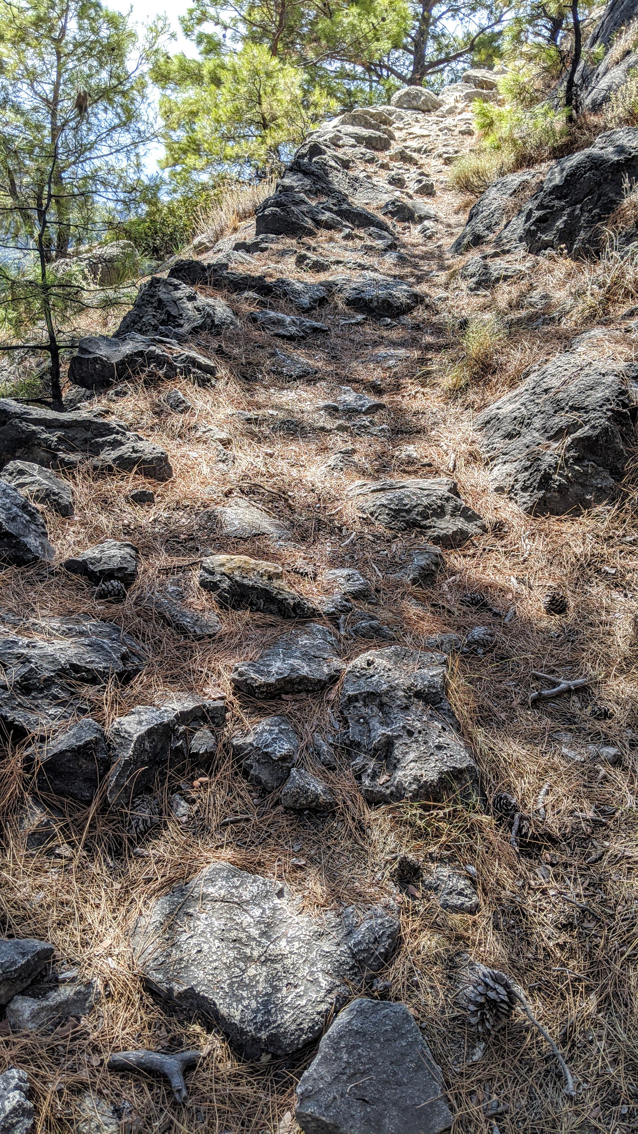 Then keep driving descending slowly towards coastal town of Portinho da Arrabida. Your goal is to find (on Google maps) the place called “Lar de ferias da casa do Gaiato.” On the opposite (from “Lar de ferias…”) side of the road there is a trail leading to the stairs which descend steeply towards the ocean.