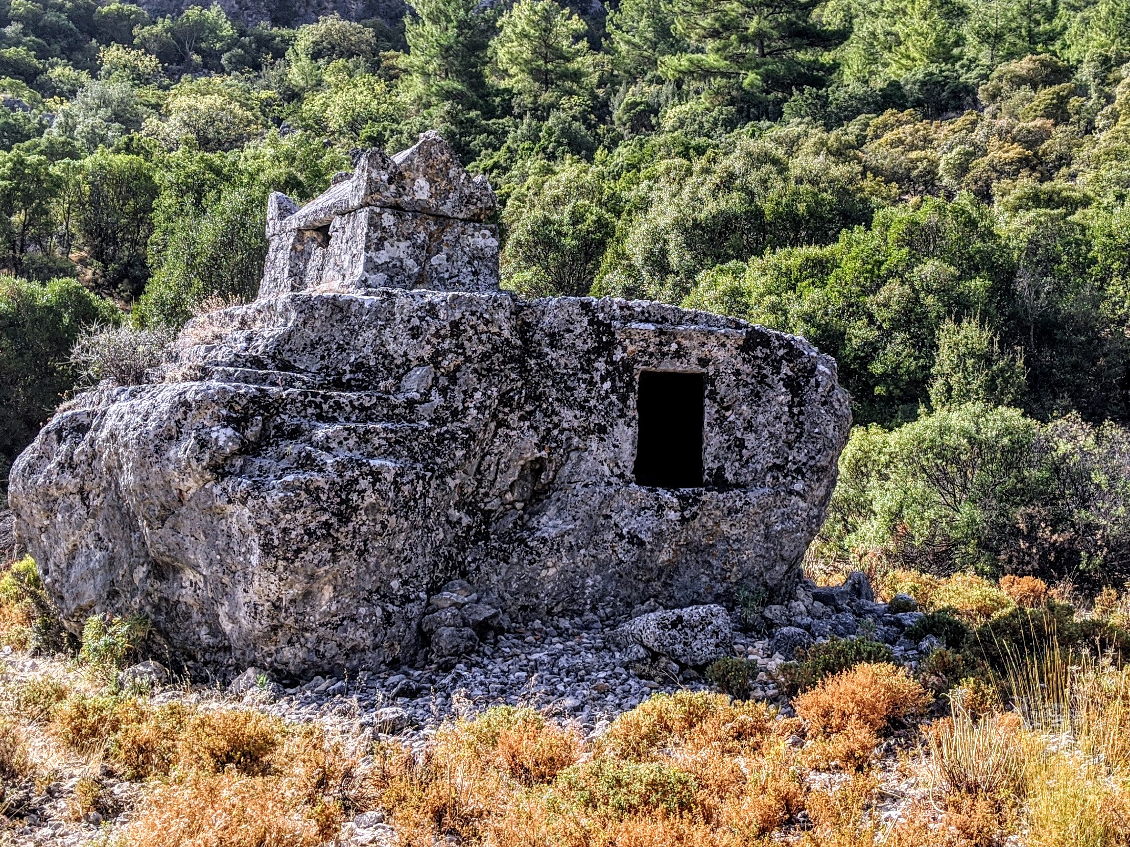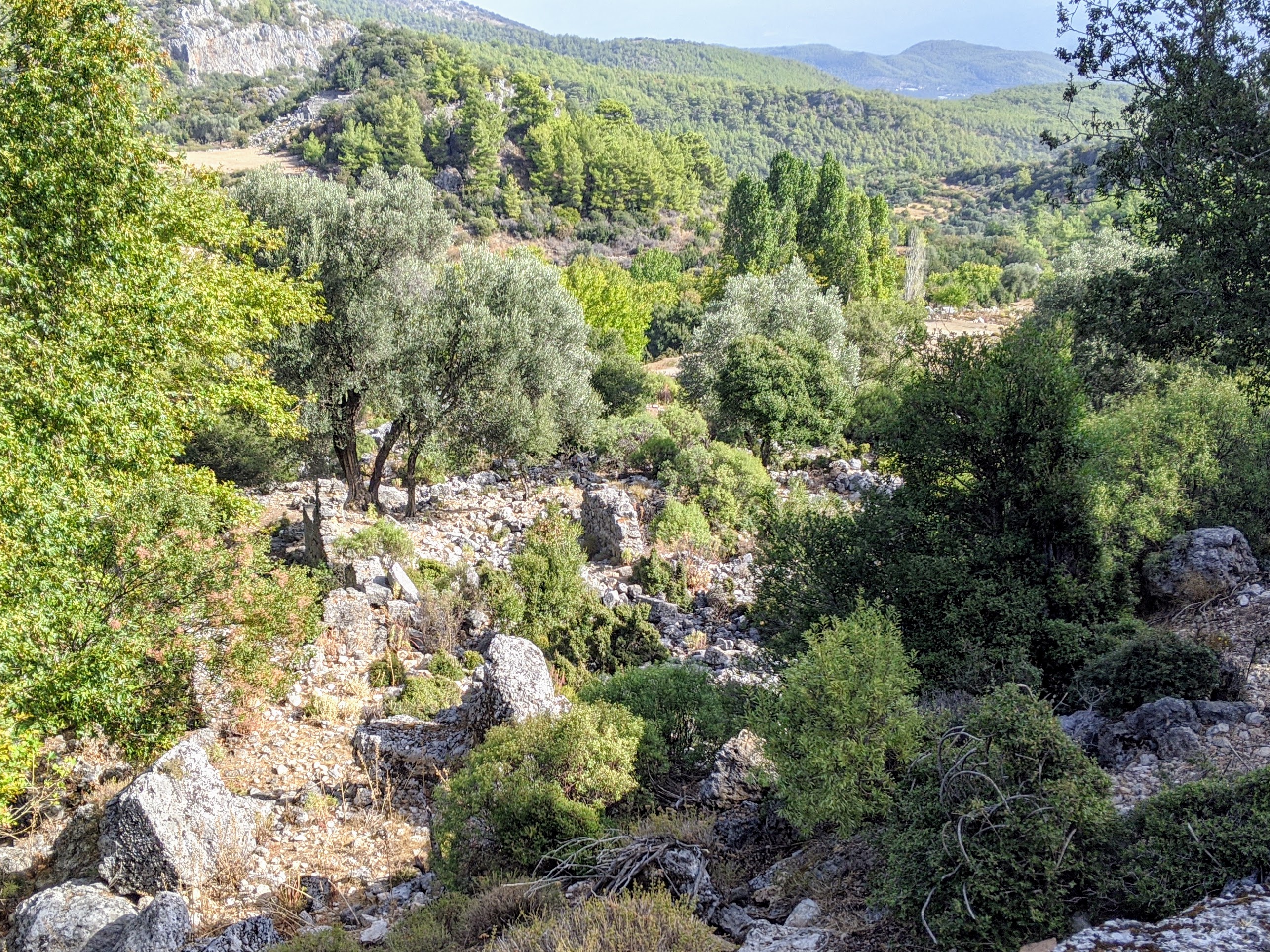 The second destination to explore from Kabak valley is more distant: it will take one and half hour to drive to the impressive ruins of ancient Pinara. Pinara was one of the six principal cities of Lycia and it is perched high up on a mountain. Despite its size and beauty, Pinara remains off the beaten path destination and is typically overlooked by people traveling to Turkey and visiting nearby Xanthos. No one else was there when I and my brother visited Pinara. After driving up the twisting road, the discrete signs opposite the parking lot are the only indication that something might be worth seeing. A small walking path takes to the entrance of the cities’ necropolis, hidden behind a forest. Pinara combines picture-perfect panoramas over Xanthos valley with the remains of temples, a theater and hundreds of tombs. Old olive and fig trees, plus the pines filling the air with their fragrance create an amazing natural setting.