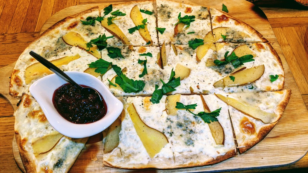 As noted, the original and traditional Flammkuchen is covered with creme fraiche, chopped onions and small pieces of bacon. Today however, you can find a lot of other versions: savory and sweet, with bacon/meat or vegetarian. Together with Michael and Katja we went for Flammkuchen to the restaurant called Weinstube Petersille (Wine Cellar Parsley). My ultimate choice was Flammkuchen with blue cheese and pears and with the side of cranberry sauce.
