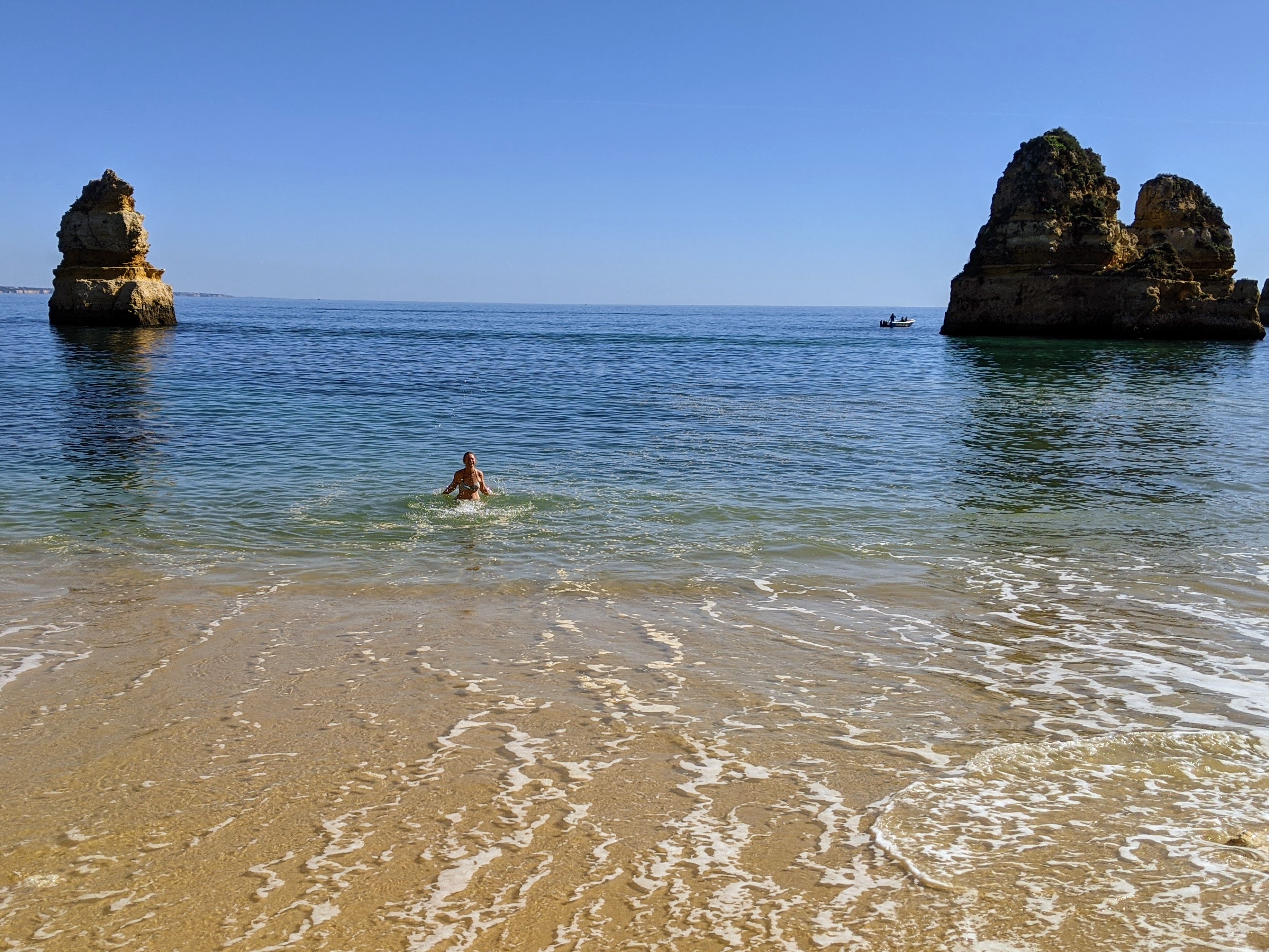 However, we went for swimming to my other favorite beach which was discovered on previous trip in May 2020: Praia do Camilo. It is situated in a very well protected cove (the water stays calm and warm) and it is surrounded by very unusual rock and sand formations.