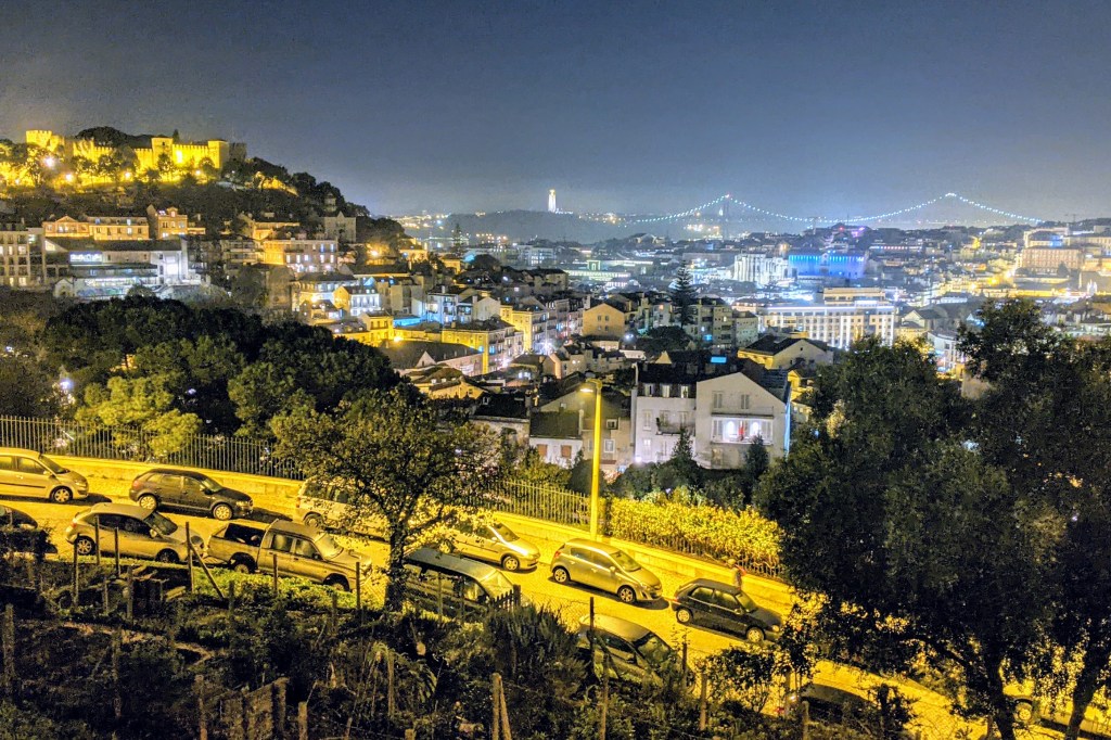 Lisbon is built on several hills and certain parts of the city offer amazing views. I rented an AirBnB in the area called Graca on Rua Monteiro Damasceno (look on AirBnB listing for Monteiro Terrace Room 1). It is one of the Lisbon’s oldest neighborhoods which is located on top of the city’s highest hill, a few blocks north-east of the Castelo de Sao Jorge (Castle of St. George). Being a truly historic neighborhood with well preserved appealing architecture, Graca is also popular with young people visiting Lisbon from different countries and it offers abundant choice of open-air cafes, restaurants, small shops, galleries, etc. Needless to say that Graca has several “miradouros” – view points. The most popular is the Miradouro de Santa Graca, which offers view on the entire central Lisbon and the Castle of St. George. But I did not need to go there, because my AirBnB apartment offered exactly the same view and I sat for an hour on balcony perusing nicely-lit city.
