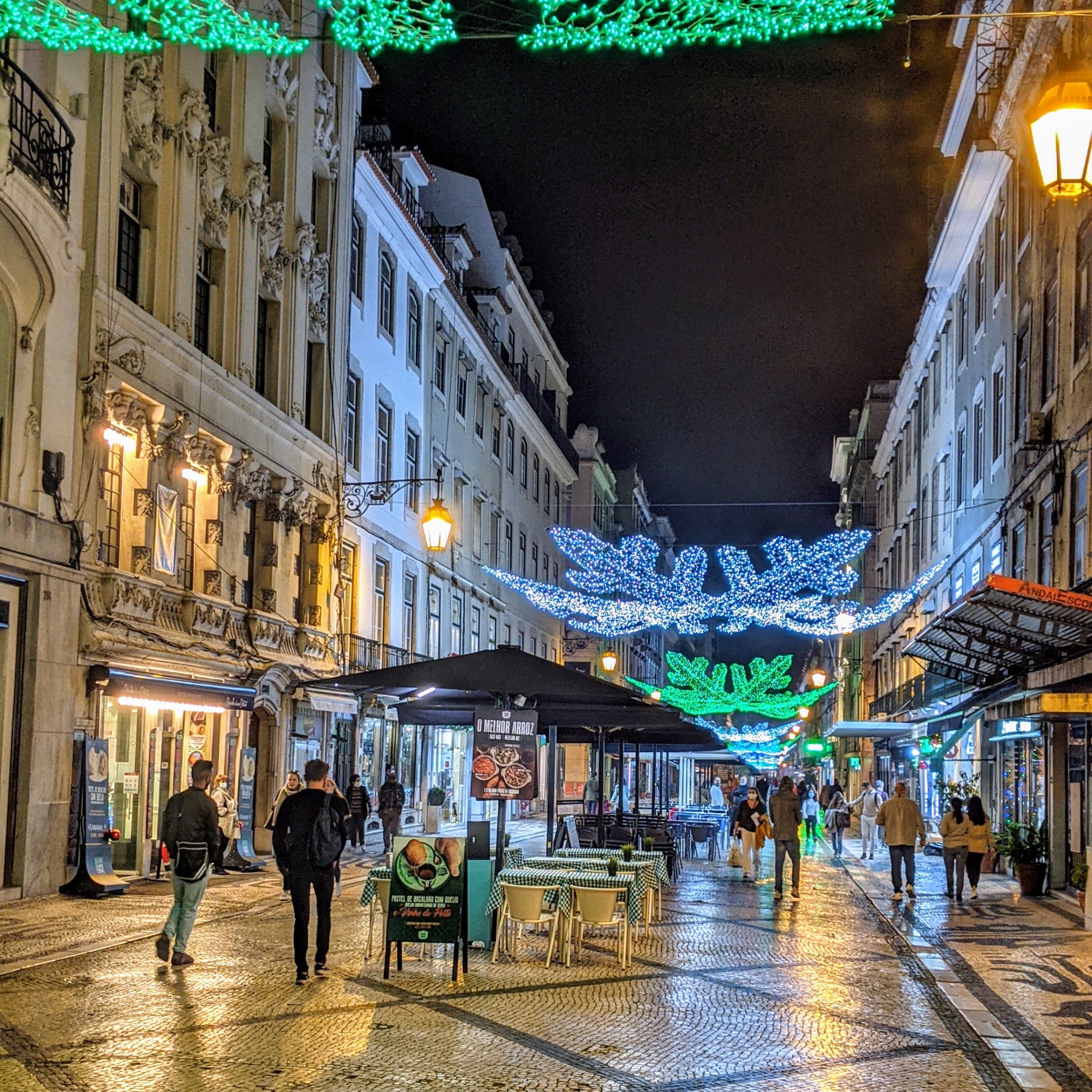 By the time I was back in Lisbon, returned rental car, took Uber into city and checked into my apartment in Graca (the one with the view over the city), it was dark already. I went for a walk and WOW: it felt like “jumping into Christmas.” The city changed quite a bit since I left for the trip to Alentejo: everything was nicely decorated and illuminated.