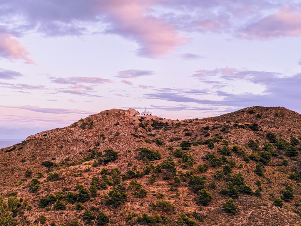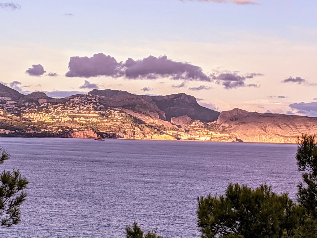 And if you arrive by the time of sunset, a great view awaits: the nicely-lit resort town of Altea to the North and the wild rocky cliffs to the South.