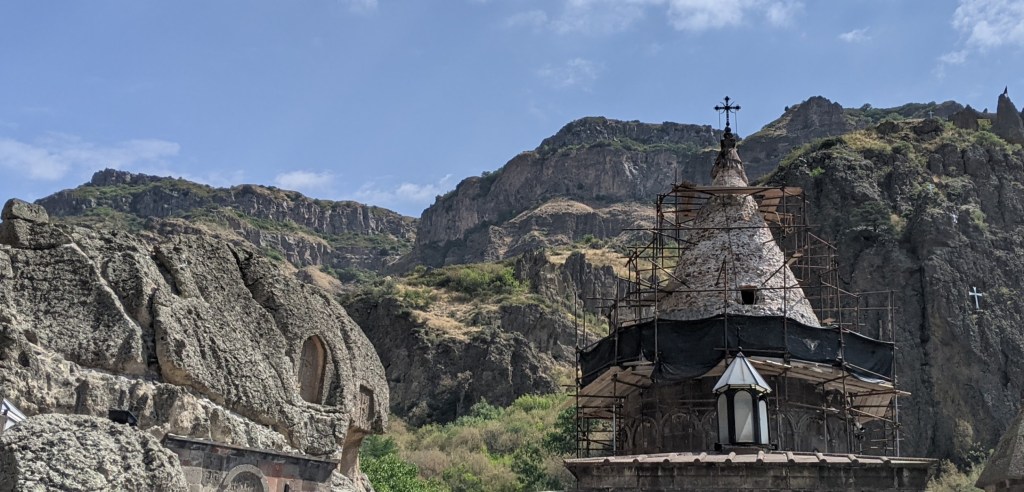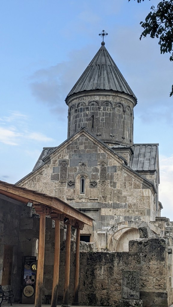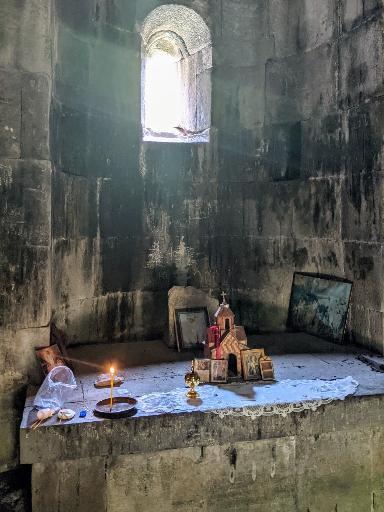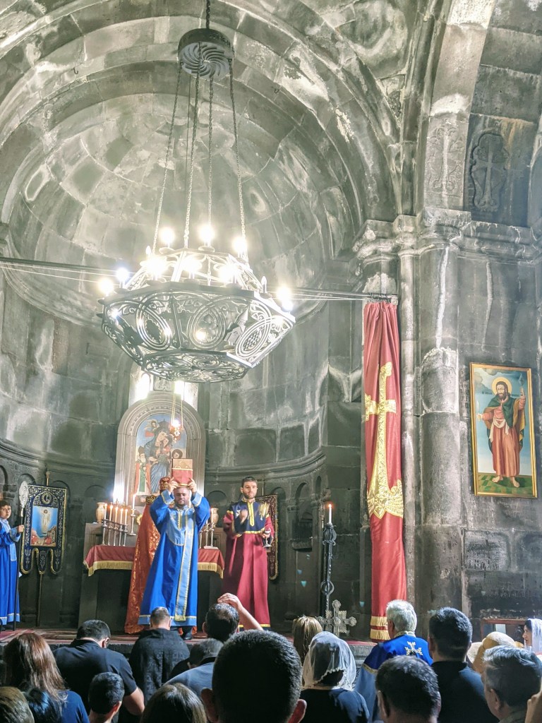 Geghard is also famous because of the many sacred relics that it housed. The most celebrated of these is the spear which had wounded Christ on the Cross and was allegedly brought to the monastery by the Apostle Thaddeus. This gave the monastery its full name, Geghardavank which means “the Monastery of the Spear.” We arrived at the monastery on Sunday morning and it was perfect timing to join the traditional, most important Orthodox worship service, called Liturgy, which was accompanied by a beautiful choral singing.