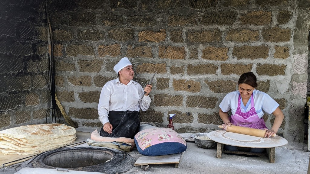 After few hours at Geghard, we were hungry. Miraculously, as we drove back through the winding canyon, a make-shift roadside bakery emerged. In the huge clay-oven, two women baked “lavash” – the paper-thin traditional Armenian bread. Needless to say that we stopped, bought and enjoyed this pipingly-hot delicacy.