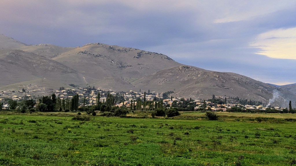 We descended back to the road by the time of sunset, and stayed here a bit longer enjoying the quietness and some good views with the town of Meghradzor in the distance.