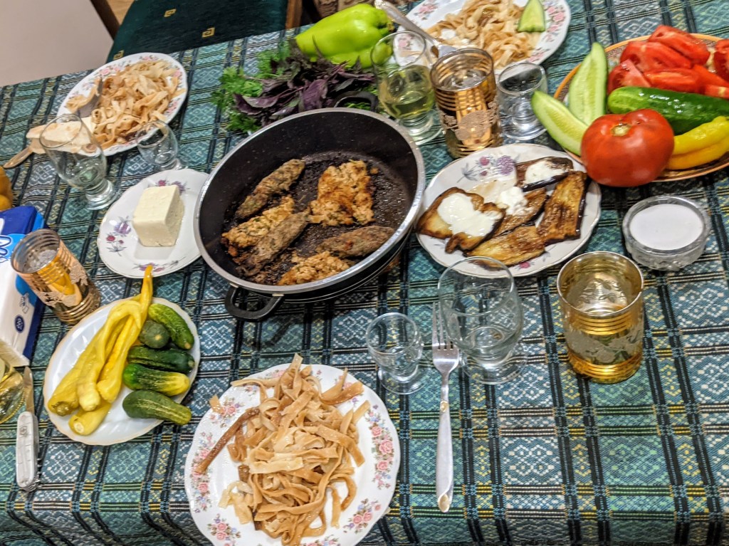 Tsaghkadzor has plenty of tourist accommodations for all tastes and budgets and – although we did not plan to stay long – it was a logical choice to spend the night. Our family-run B&B was called Guest House Arsan. It does not have a website or even a Face Book page, but you can find it on Google maps or booking.com. In fact, I do not think that they need any additional advertisement, because most people who once stayed there keep returning year after year. Arsan belongs to the family of Oganes Mkrtchjan, who used to be a deputy mayor of Tsaghkadzor. Needless to say, that he knows everyone in the town and everything about the area. The rooms were big and comfortable, the price ridiculously low (something like $40 including breakfast), but the biggest highlight of this Guest House were the hosts themselves: the cheerful story-teller Oganes and his super-welcoming wife, Svetlana. We asked in advance Oganes and Svetlana to prepare “something traditional” for the dinner and this was table awaiting us.