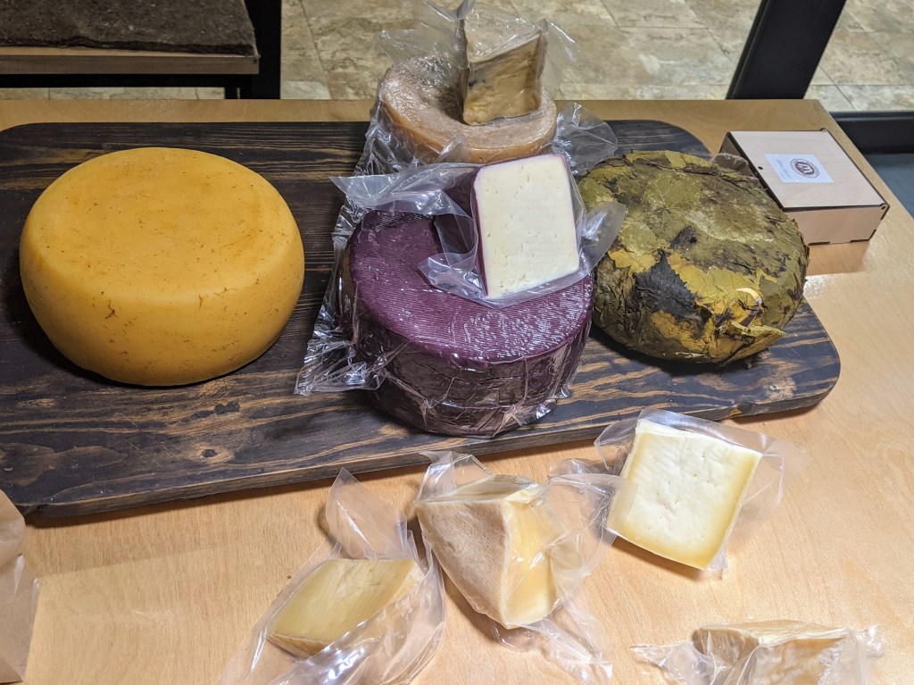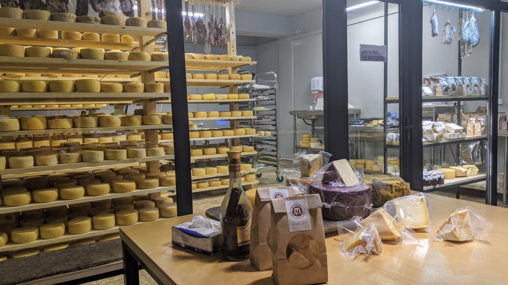 My fellow travelers, Vladimir and Elena, lingered somewhat longer inside the monastery’s church, and I began playing with Google maps exploring the nearby area. Suddenly, something interesting popped up: the sign on Google maps said “Mikayelyan Farm Factory.” The associated picture displayed a cellar full of heads of cheeses. All of us are cheese-lowers, and we drove to the village of Gavar where the farm was located. Long story short, a big extended family from the capital Yerevan moved here in 2012, bought properties, and began production of fine cheeses. Most of them (made of cow and goat milk) are well aged (at least, 4 months) and some are fermented with added brandy, grape leaves, cinnamon, or wine. The selection is impressive (about 10 kinds) and the entire set-up for wine-and-cheese tasting is enjoyable.