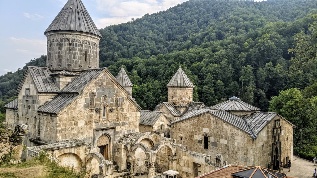 The main official attraction near Dilijan is a huge monastic complex called Haghartsin, and by the end of day we drove there. Its name translates as āsoaring eagle.ā The legend says that by the time of monastery’s dedication, an eagle was soaring over the dome: āHaghā means playing/soaring and āartsā refers to an eagle. Hagartsin was continuously built between 10th and 13th centuries. It has three churches: St. Astvatsatsin, St. Gregory, and St. Stepanos. Besides churches, Khachkars (Armenian cross-stones) are dispersed trough the monastery’s lands. Regardless of monastery’s historical and architectural importance, for me, the major attraction was its location: a gorgeous combination of the ivory color of buildings which are in perfect contrast with the surrounding green woods.
