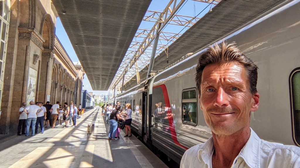 Yerevan was the last point of this trip for my friends, Vladimir and Elena: next day, they flew back to Moscow. But I planned to continue the journey together with my sister-in-law, Olga, and visit the Republic of Georgia, another part of former Soviet Union. There is a modern and comfortable train which connects the capitals of Armenia (Yerevan) and Georgia (Tbilisi). It leaves at around 1 pm from Yerevan and arrives at around midnight to Tbilisi. I headed to the train station and boarded this train.