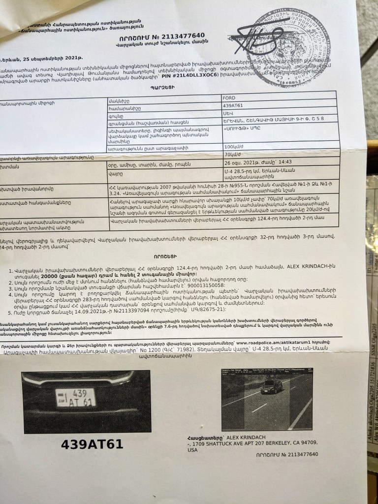 But the story about adventures in Georgia and Northern Turkey will be in another post. However, the trip to Armenia “caught up with me” in an unexpected way upon return to California. About a month later, I received by mail seven speeding tickets. Granted, I was driving there fast, but not too fast and the roads were modern and wide. Regrettably, I did not bother to inquire about the actual speed limit which – as it turned out – is quite low, less than 60 miles per hour even on major highways. It has also taken a while to figure out information on these speeding tickets, because everything was in Armenian.