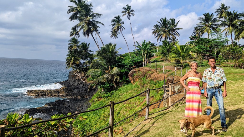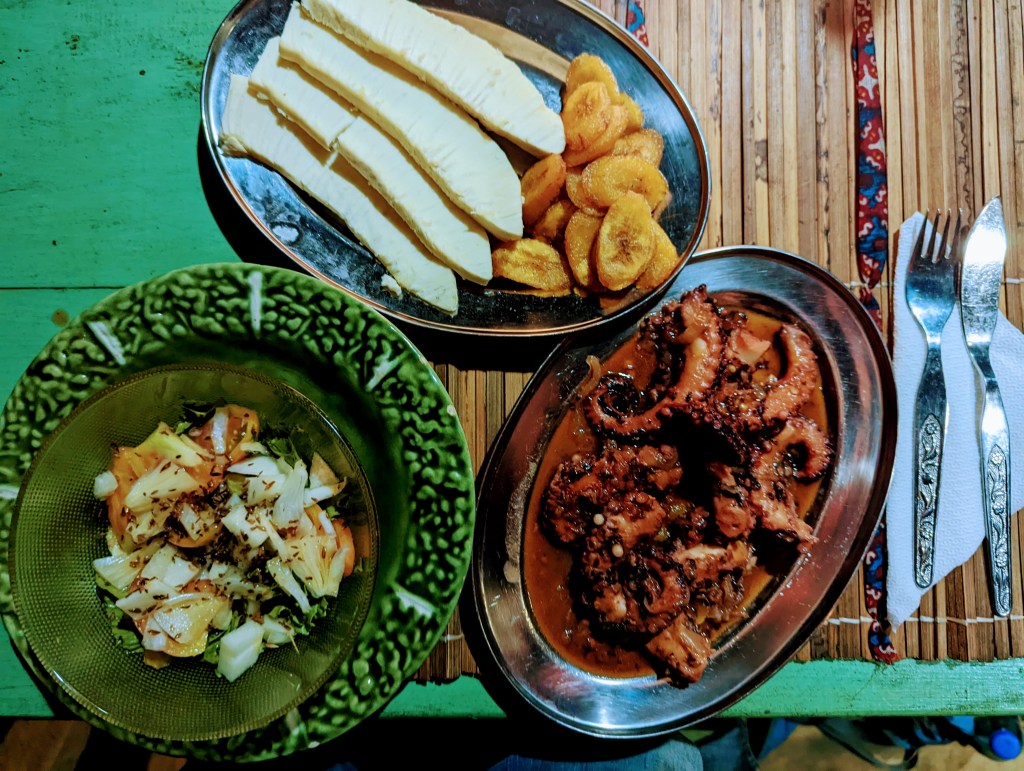 A pre-arranged driver was waiting outside to take me to the first destination: a small resort, on the coast, 15 miles southeast of Sao Tome city which is called “Nge D’ Ai EE” or “Center D’Aqui Nge” (you can easily Google both names). It was dark and late, when I arrived, but the expertly prepared dinner was served and waiting: octopus Portuguese style – one of my very favorite dishes.