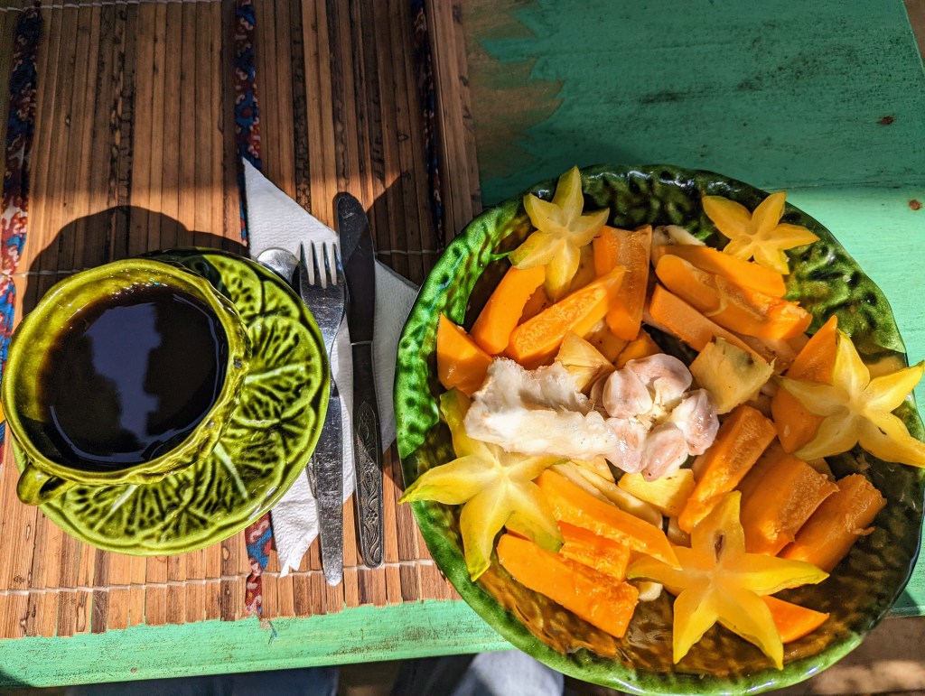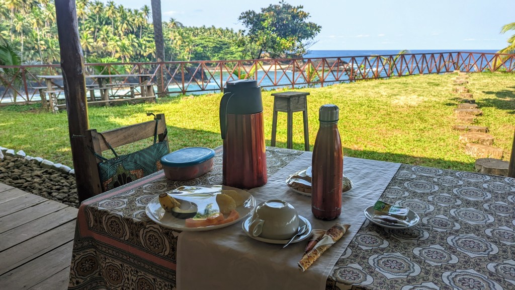 Next morning, on the same table, I found beautifully arranged “tropical breakfast” which was accompanied by the locally grown coffee. Speaking of the latter, coffee is an excellent choice to bring as a gift from Sao Tome.