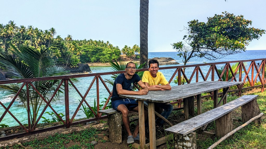 Roca is located in the town of the same name (Sao Joao de Angolares), but a bit up the hill from the coast. I booked dinner at roca, but choose to stay in a small hotel-restaurant called Mionga which was right next to the highway and also very close to a local beach. The reviews on Google maps praised Mionga for genuine hospitality, good accommodations with much lower price than at roca, and (!) also outstanding restaurant with owner, Nelitu, being also a main chef. When I arrived in early afternoon, the place was jam-packed with tourists who came here specifically for lunch. The view from restaurant was great and food looked delicious. In fact, I nearly regretted that my dinner is already booked at roca.