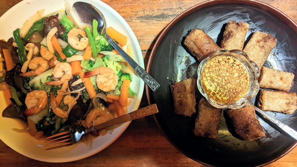 It was time for dinner and I returned to Coco Home Bar and Restaurant for another delicious meal: home-made and freshly backed vegetable spring rolls and stir fried shrimps with mushrooms and vegetables.