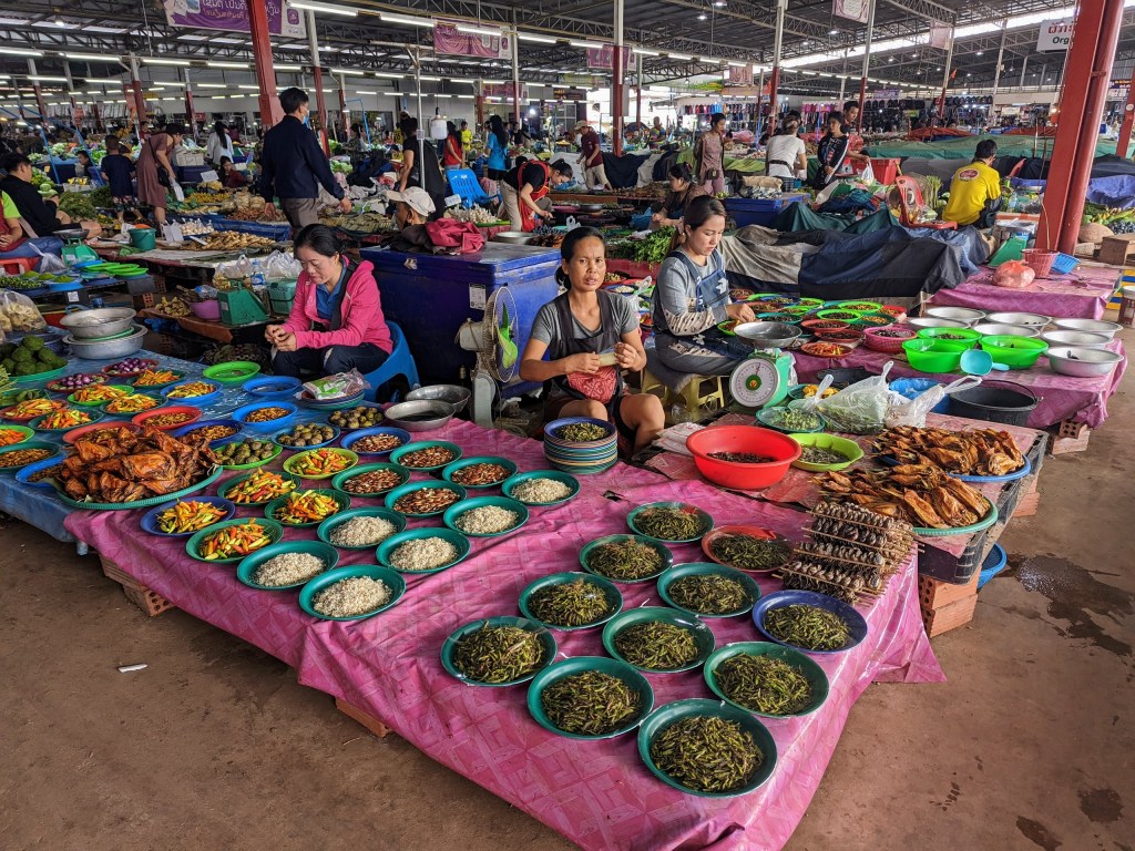Anyway, when I arrived to Southern bus station, I had already my ticket for Kong Lor, the first destination in Laos. I also had some time before bus departure and went to a huge market which is right next to the bus station. Wow! It was an impressive selection of meats, seafoods, fruits, vegetables, and prepared foods.