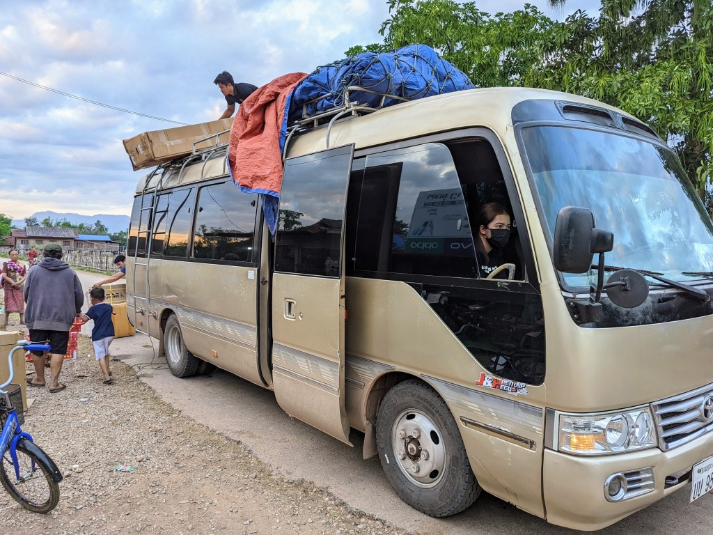 The bus ride from Vientiane to Kong Lor (which is famous for its huge underground cave system) takes about 8 hours with a few stops for food and restrooms. The bus was pretty full, and most luggage was placed on the top and secured by the ropes.