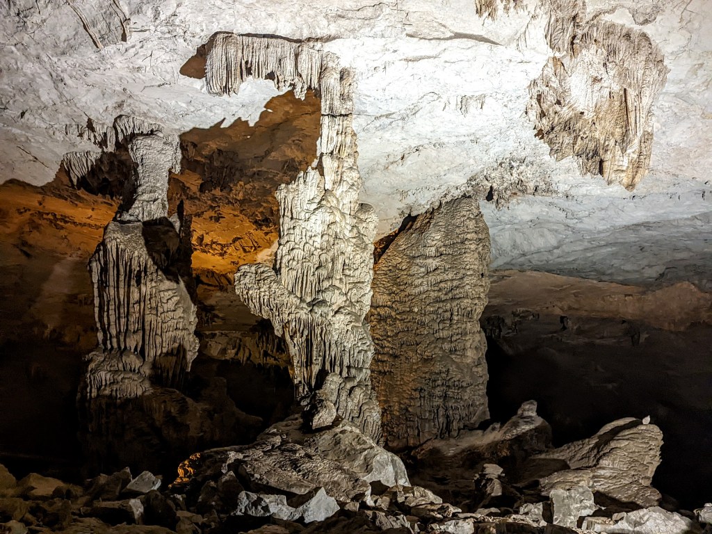The cave is not lit and the boat journey goes in nearly full darkness except the headlamps of the guides and tourists. In the middle of the cave, there is an option to get on the shore and walk around stalagmites and stalactites. This small part of the cave is illuminated by electrical lamps.