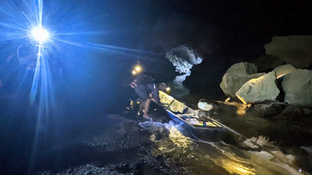 Approaching the other side and exit from the cave, we had a little unplanned adventure. The water level was low, and the river run dangerously through the stony rapids. We got out of the boats and drugged them through this portion of the cave.
