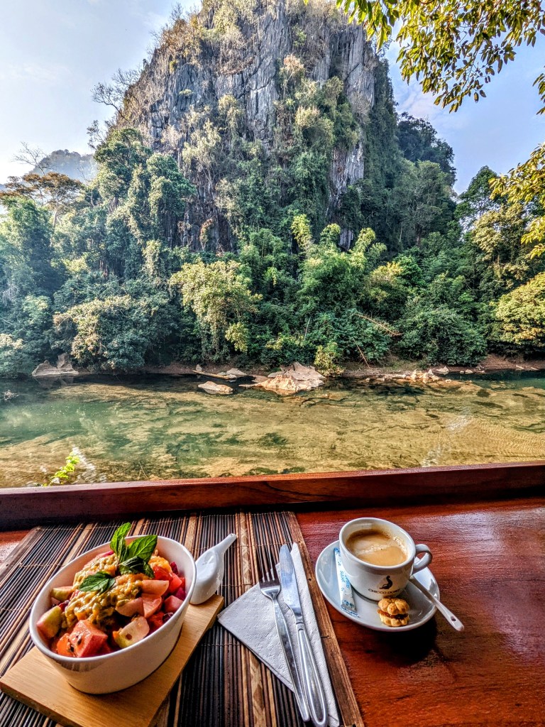 There are a few guesthouses in Kong Lor itself, but my choice was different: I stayed in the Spring River Resort. It is about 2.5 km / 1.5 miles away from the village, situated in the lush tropical forest, on the bank of the river with the gorgeous view of the surrounding mountains.