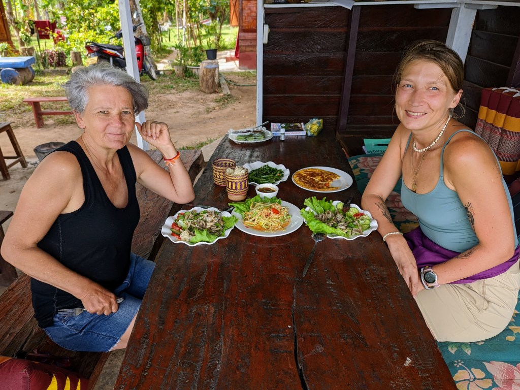 But, yet, one “adventure” was planned. I mentioned previously that the food served at the Don Som Riverside guesthouse is excellent. And this is for a good reason: Tanoi also offers professional classes of cooking Laotian dishes. The process begins from the visit (across the river) to the local market, selecting and purchasing all ingredients, step-by-step preparations, and, finally proper serving. One of the persons who stayed at the Guesthouse, was Karolina, a young lady from Poland. She was especially interested in learning more about foods of Laos and took cooking class with Tanoi.