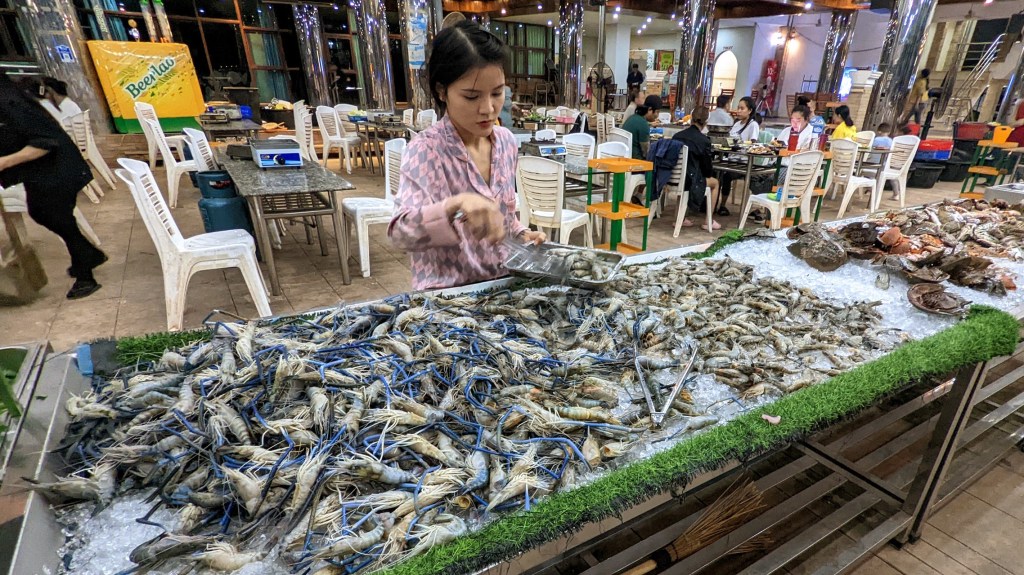 The surprise came, when I went out in search of some place to eat. Right next to apartments, there was a restaurant called “Moon the Night.” It was an all-included buffet-style seafood place with one interesting caveat: a huge variety of fish and shell-fish was offered to patrons uncooked along with cooking equipment (electric grill, oil cooker) and utensils. Essentially, the concept was: “Cook it for yourself and eat as much as you wish.”