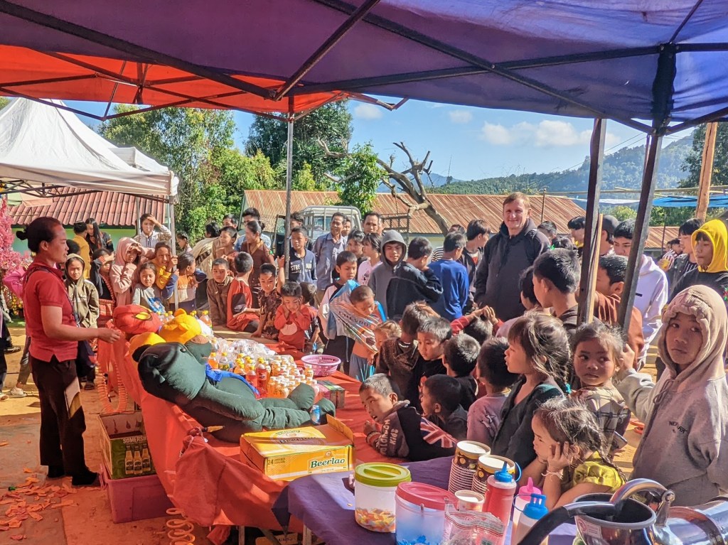 Another activity – mostly popular with children – was a board game similar to dart. When I approached the crowd, I discovered one more non-Laotian person at this festival: the tall fellow was – similarly to me – the tourist, a Romanian living in the USA.