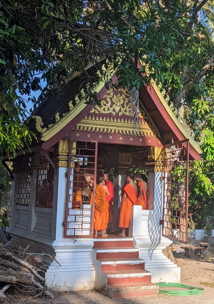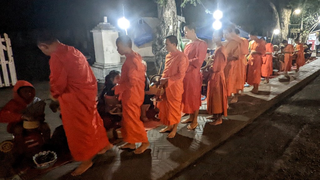 The next morning, I needed to be at the airport at around 9.00. There was still time for one more experience which is the “specialty” of Luang Prabang: the daily alms giving ceremony. Every early morning (before sunrise), Buddhist monks from the various monasteries walk through the streets of Luang Prabang collecting alms – the food donations offered to them by the locals and visitors.