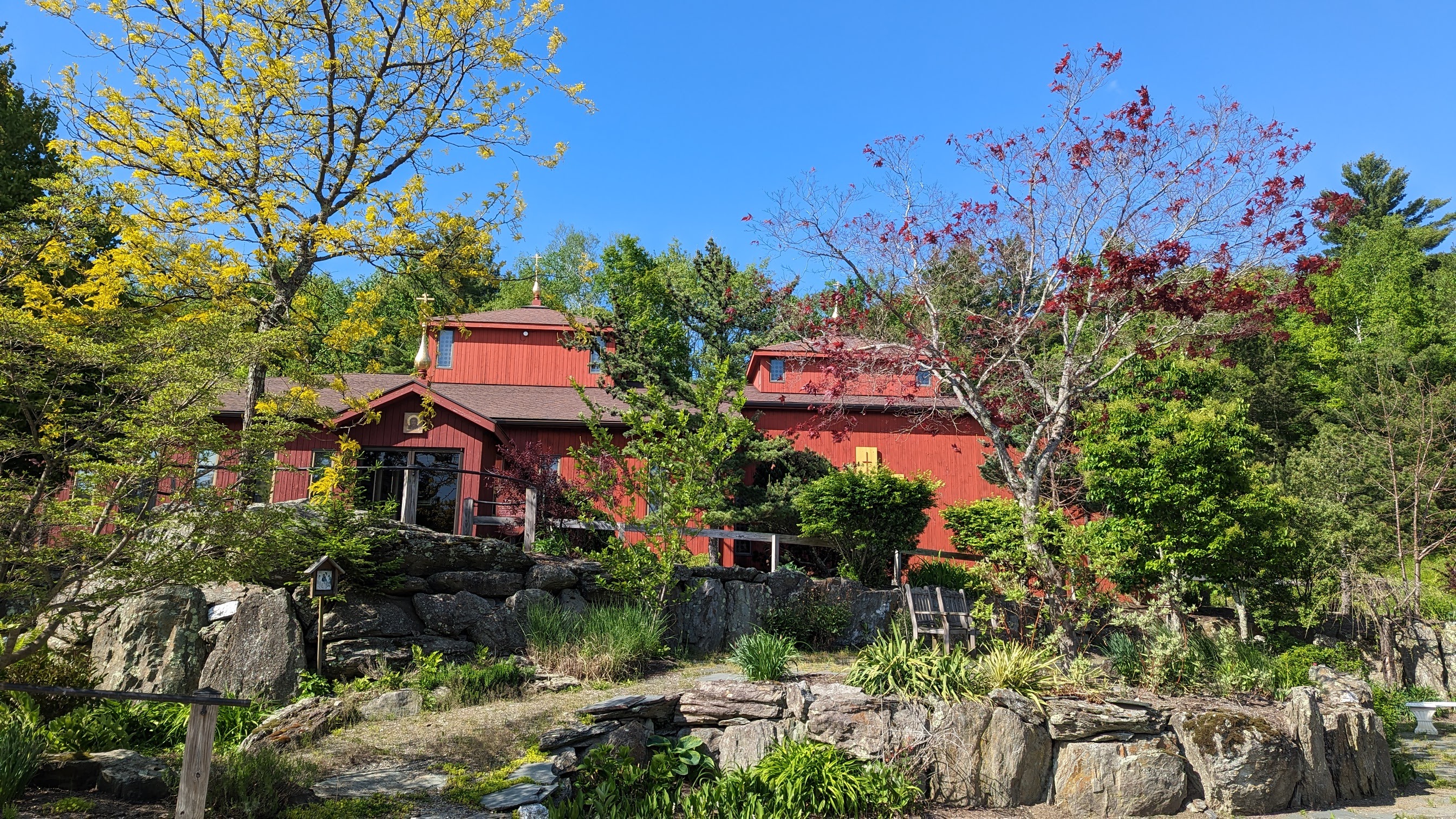 The first monastery’s church, Holy Transfiguration Temple, was built in 1969 in a classic Slavic style. With rough-hewn exterior and gold-leafed onion-like cupolas, it is reminiscent of village churches in Northern Russia or Finland.