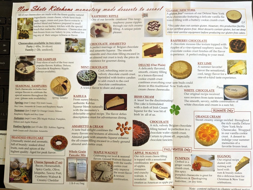 However, the entire point of coming in-person is to meet the nuns. Then you will have a chance to talk with them and may hear a lot of great stories about New Skete and their lives (but I strongly suggest to make appointment in advance). Some of these stories are lighthearted and humorous. Like, for example, a memorable but rather disastrous event known as “Chocolate Niagara Falls.” What happened on that day was a mistake in the baking process resulting in melting of more than 100 chocolate cheesecakes which literally flooded the kitchen.