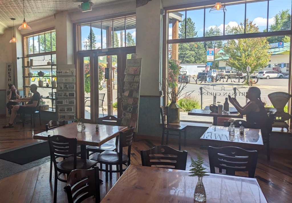 Hence, I was curious: what type of place it was and why is it so popular that people drive significant distances to visit? The first sight, when we arrived, was pleasant: a nicely refurbished brick building with floor-to-ceiling windows. It clearly stood out in appearance from all other homes on Main Street of Deary.