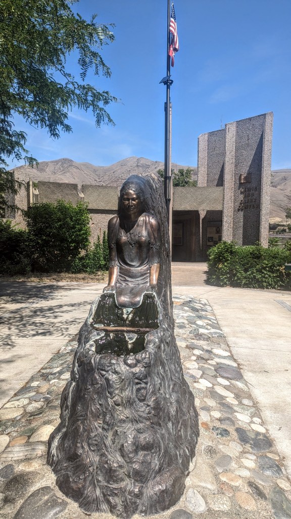 Besides this cool statue, the Center (which is open 24/7) has a small but well organized exhibit area. It depicts the full story of Lewis and Clark expedition, and, also, the role of the local Nez Perce Indian Tribe who essentially saved expedition from starvation in winter of 1805 and helped to get over continental divide the following spring. Nez Perce people are especially credited with the fact that they taught Lewis and Clark to build Indian-style canoes which were much more efficient and sturdy than the boats used by expedition.