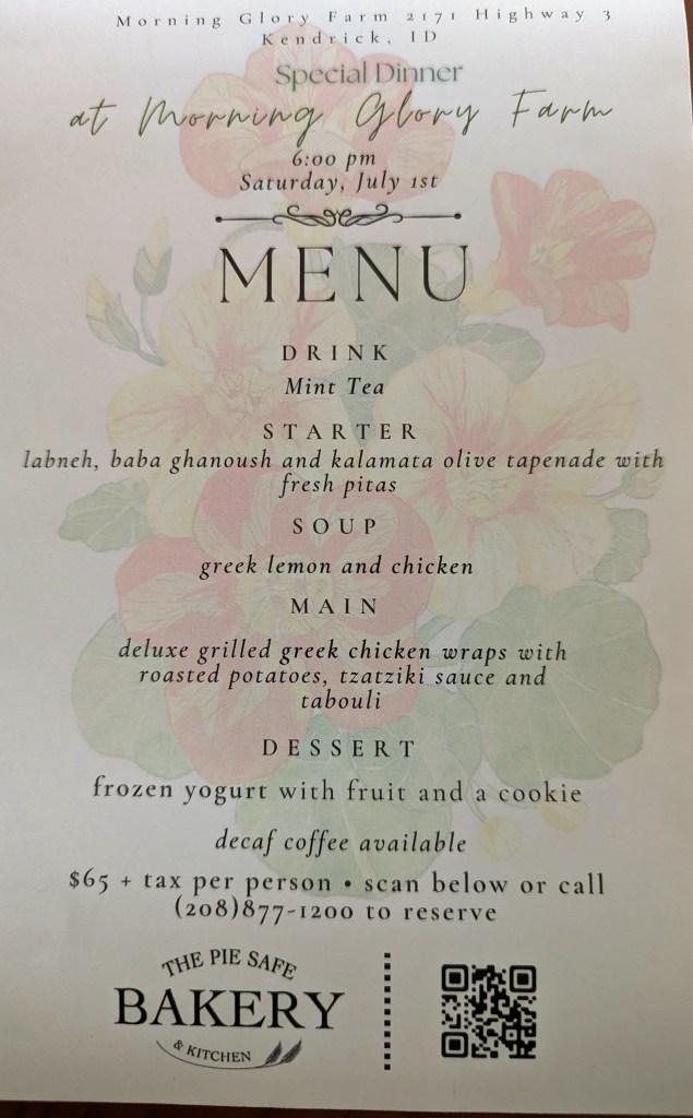 Then I noted a gourmet menu for a dinner which was organized by the bakery, but in a different setting: the meal will be served on what was called “Morning Glory Farm” in a nearby town of Kendrick.