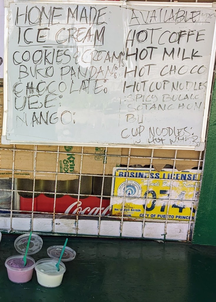 As to Puerto Princesa, it turned out to be an “Okay” place, but nothing special to write home about. Except, three fun experiences. First, walking around the town, I saw a nearly dilapidated building. The handwritten sign in its window promised “home made ice-cream.” I knocked on the door, and the smiling lady came out and offered a choice of four different ice creams. All were made in her private kitchen and all flavors were delicious. At 20 US cents per portion, it was a steal!