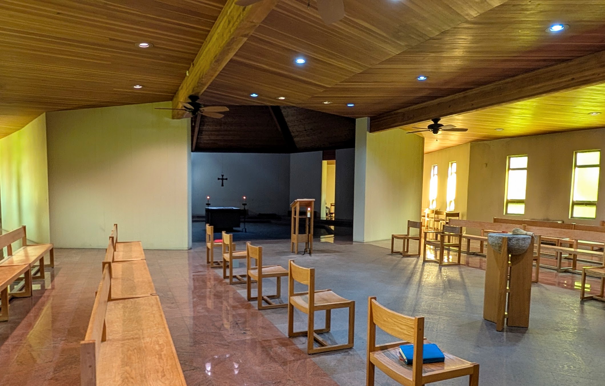 After check-in, I walked to the church. It was early Sunday afternoon and the main worship service – the “Mass” – was over (on Sundays, it begins at 11 am). The church was very brightly lit: mostly with the natural sunlight coming from wide windows. It was a good time to be there: to calm down, say quiet prayers, and prepare mentally for the different pace of life during the next days.