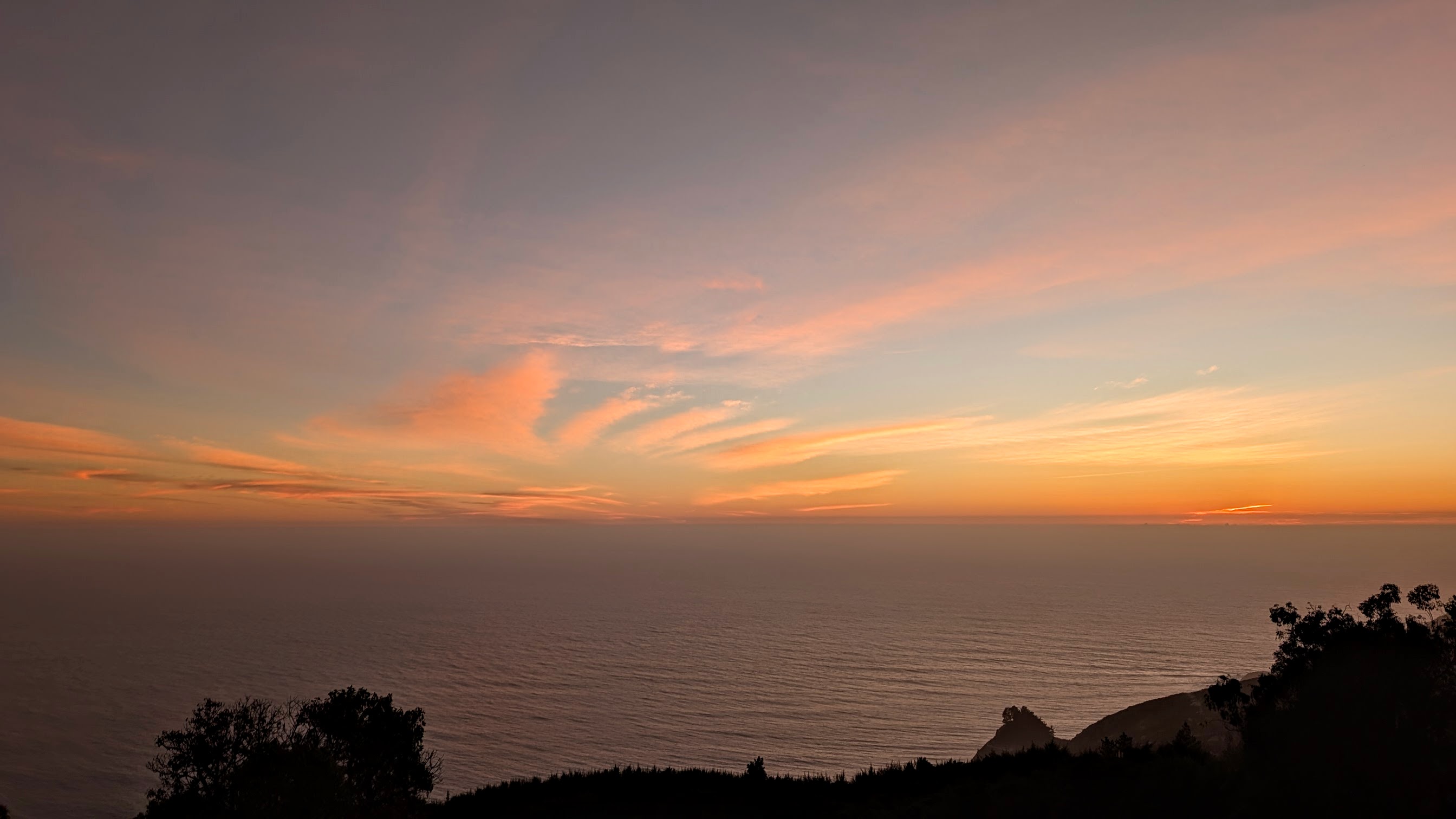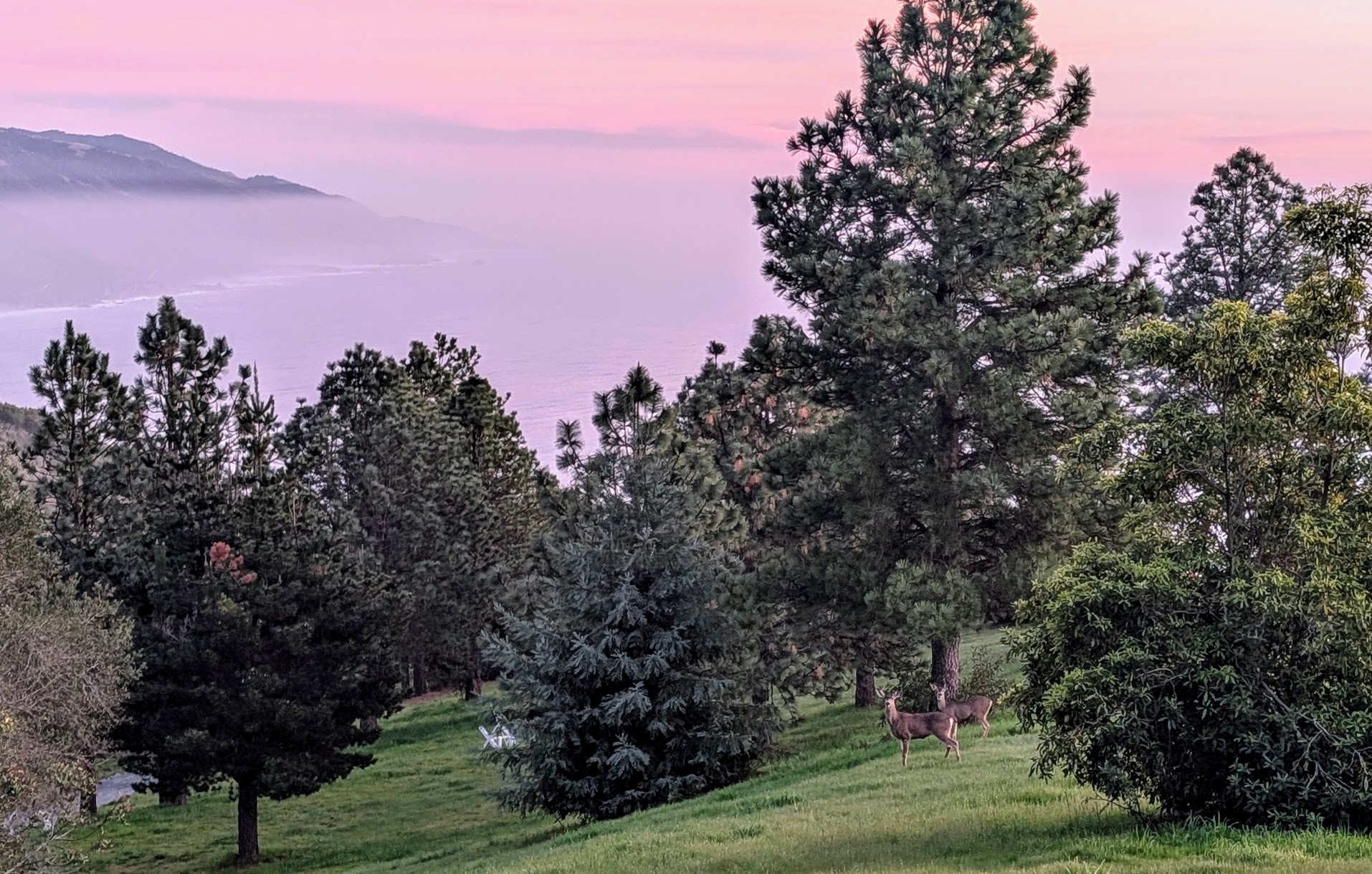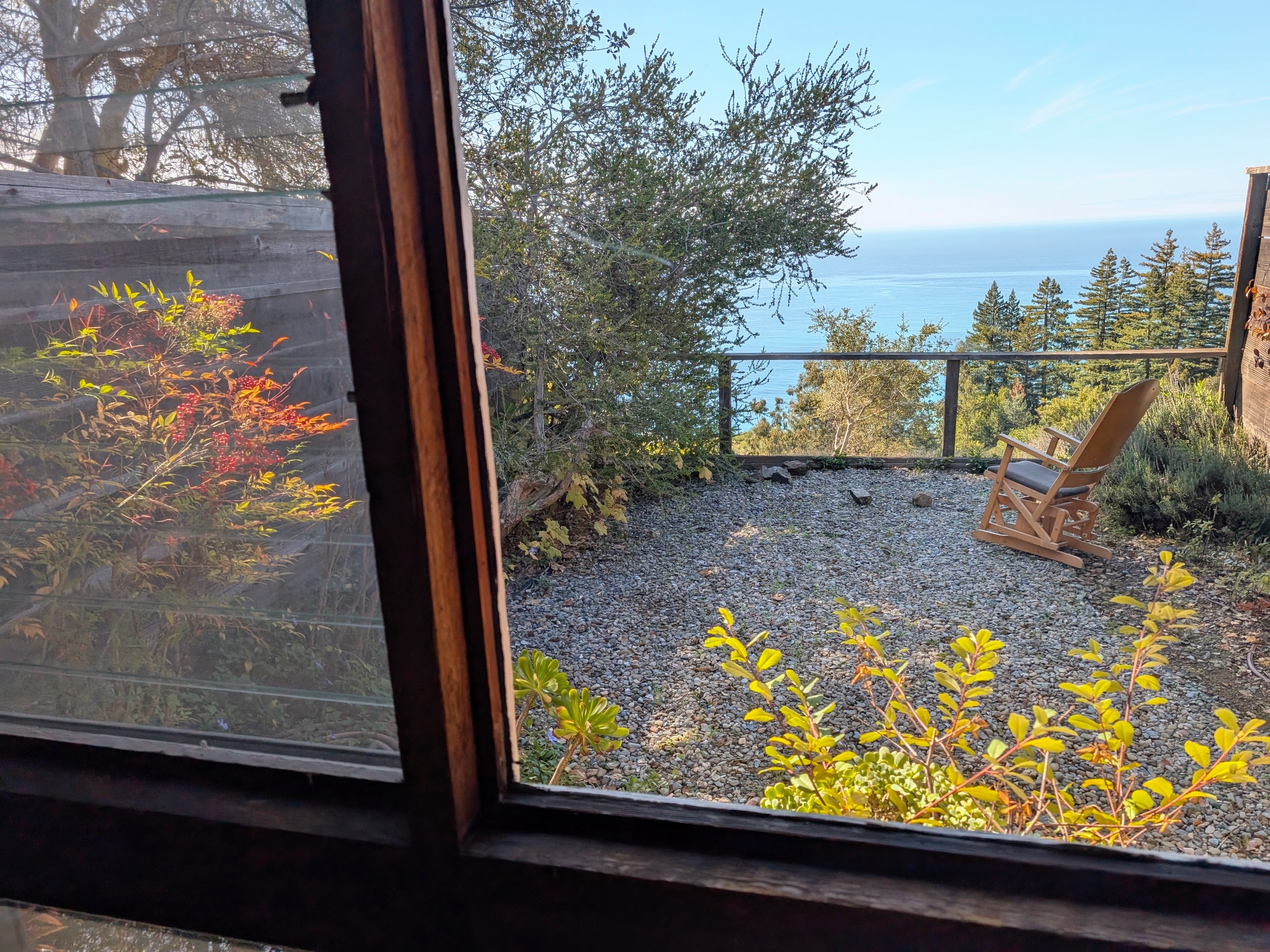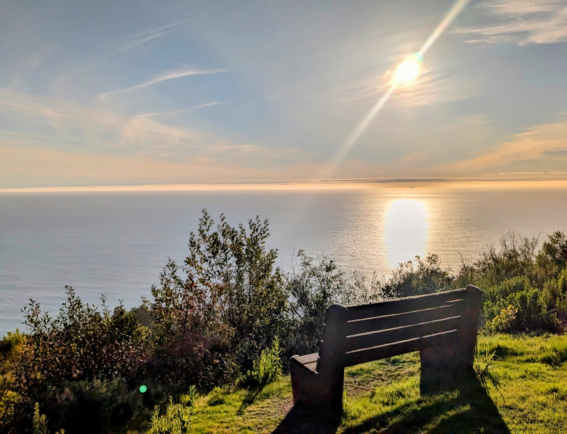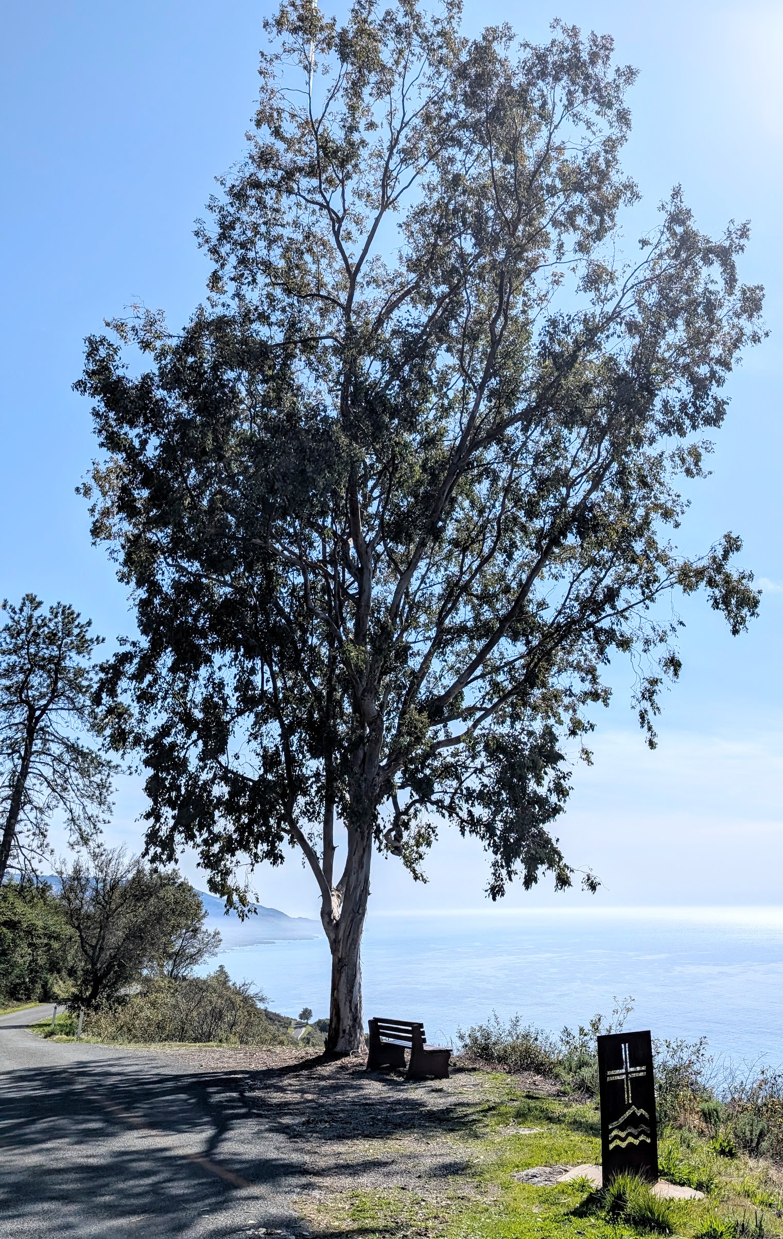 I had a few hours until evening worship service (“Vespers”), and it was a good time to walk around and explore. The first order of business, however, was having some lunch. Hermitage provides excellent meals for all overnight visitors, but the weather and setting were so gorgeous that picnicking “al fresco” was by far best option. I walked back along the road from Hermitage to Highway 1. Only a hundred yards / meters down the road, there was a tree and a bench overlooking the ocean.