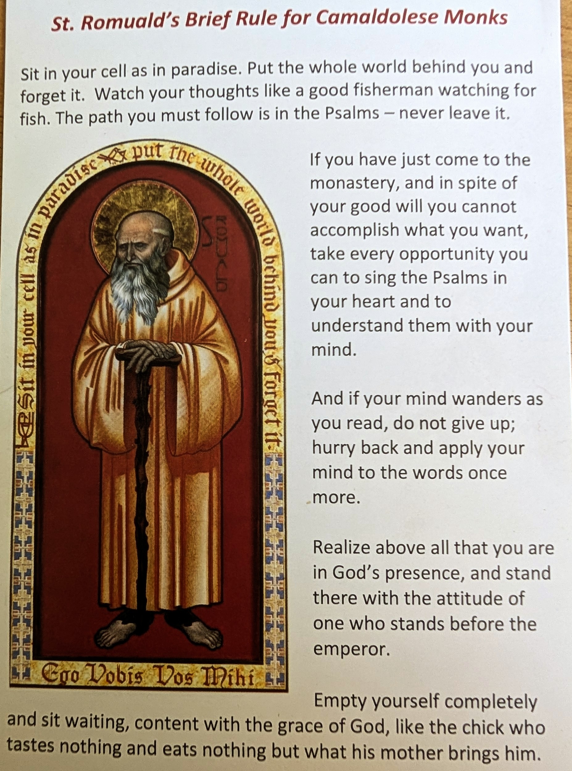 St. Romuald felt a need to renew monasticism by merging the eremitical tradition with that of cenobium. He thought about integrating Eastern Christian solitary heritage in Western Benedictine communal living. And this is how Camaldolese order was born. In essence, Camaldolian monks typically live in a commune, but also spend sufficient time in solitude with focus on prayer and self-reflection. St. Romuald’s way of thinking is expressed in his “Brief Rule.” See below.
