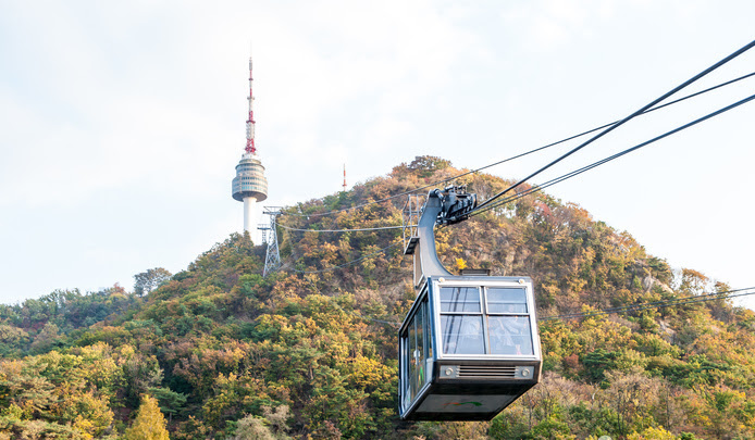 There are three ways to get to Namsan Tower. One is an uphill hike from the bottom of Namsan Park. The path consists of stone stairs and paved walkways winding through the forest, and you will need about 45 minutes to reach the tower. The second option is a shuttle bus (Yellow Bus #01) which runs very frequently from the Chungmuro or Dongguk University subway stations.
