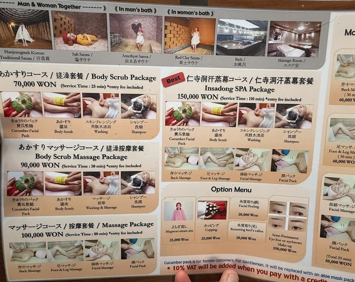 In case you will are tempted to visit Insadong Spa & Sauna, here is the full “menu” of treatments and services. .