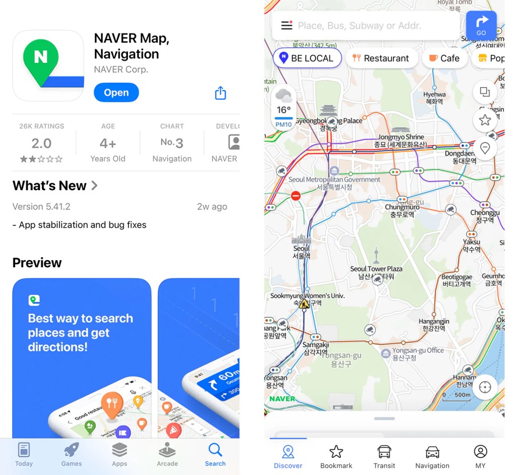 First, download from the Apple/Google online stores, and install on your smartphone “NAVER” – the Korean version of “Google Maps.” Due to government security regulations, Google Maps do not function properly here, and the walking/driving/public transit directions won’t work at all.