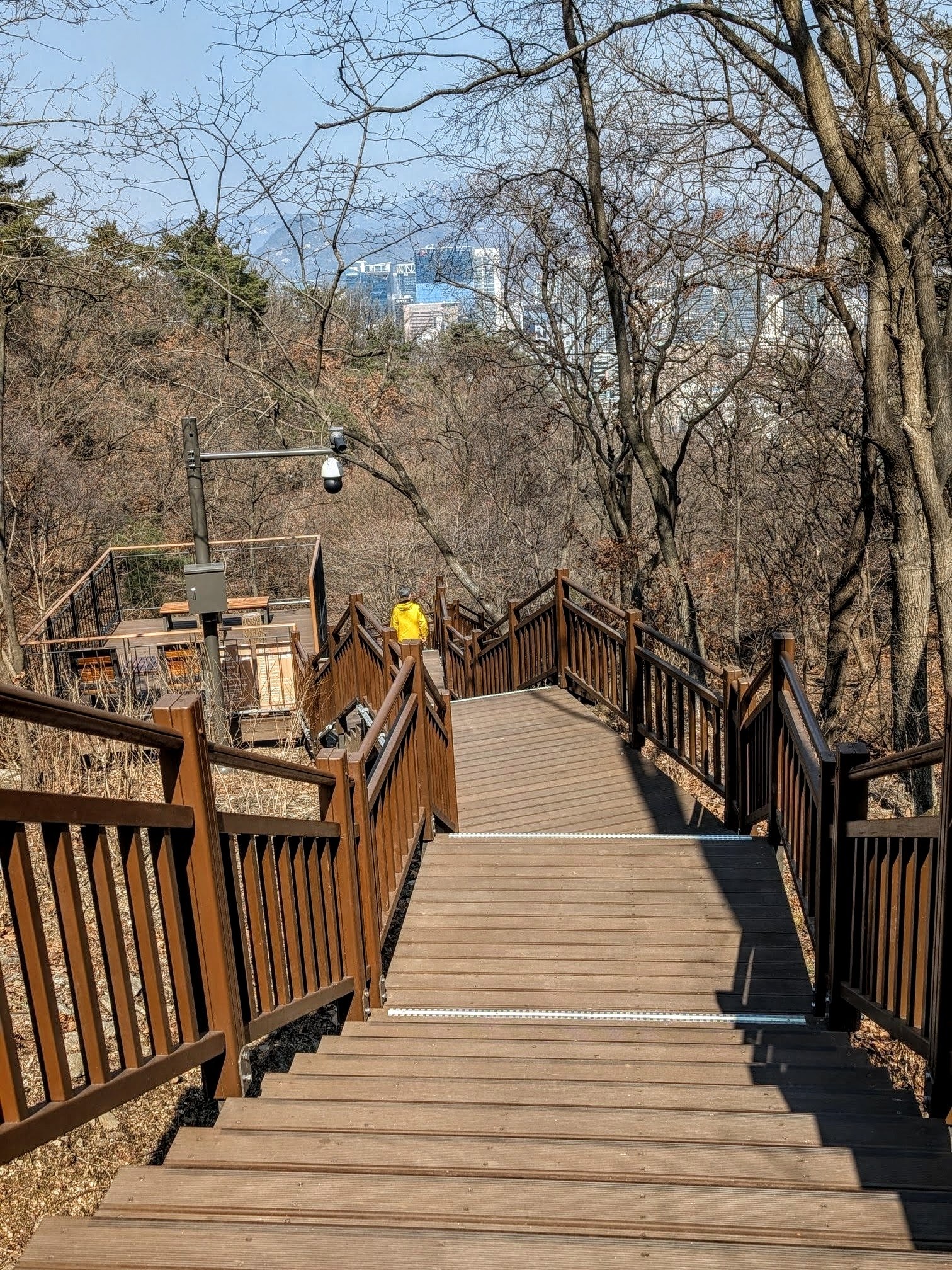 To go back to the city, you can use the same cable car. In fact, a round-trip is only KRW 3,000 / $2 USD more expensive than one-way ticket. I recommend, however, going for an easy (20-25 minutes) and pleasant downhill hike through the forest on the slopes of Namsan Mountain.