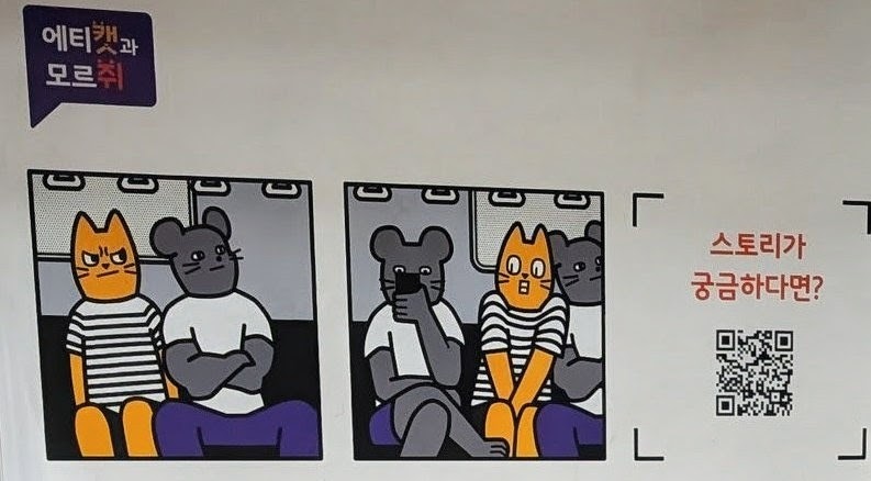 These characters are “Etiquette Cat” and ” Meok-Choo” (a mouse). The former represents a well-mannered person who follows all the rules. As to the latter, his name is a pun on the Korean phrase “I don’t know.” This character often violates various subway protocols, like blocking doors or talking loudly on the phone. The QR codes next to the cat and mouse lead to digital comics on proper behavior.