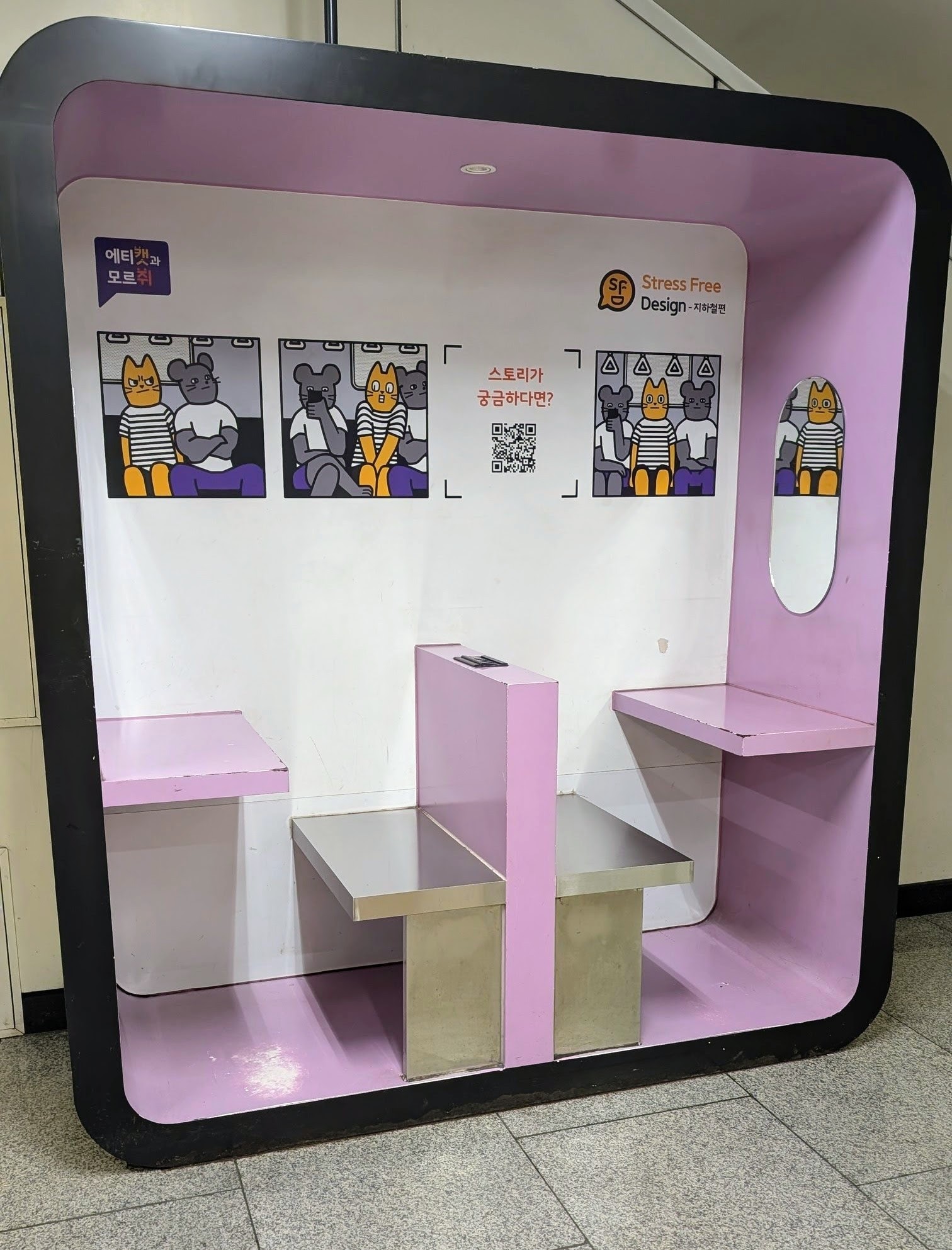 Finally, about one more “fun service” offered by Seoul’s metro. At many stations, walking along platforms you will see rectangular “open face” booths with benches and, sometimes, tables inside. Here is an example.