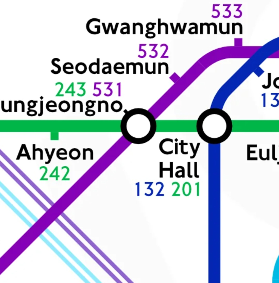 Third, all subway lines are color-coded and numbered. Subsequently, each station is also coded with three digits, where the first digit is the number of the line. For example, the green line encircling central Seoul is line #2. Accordingly, all stations on this line are numbered from 201 (City Hall Station) to 243 (Chungjeongno Station).
