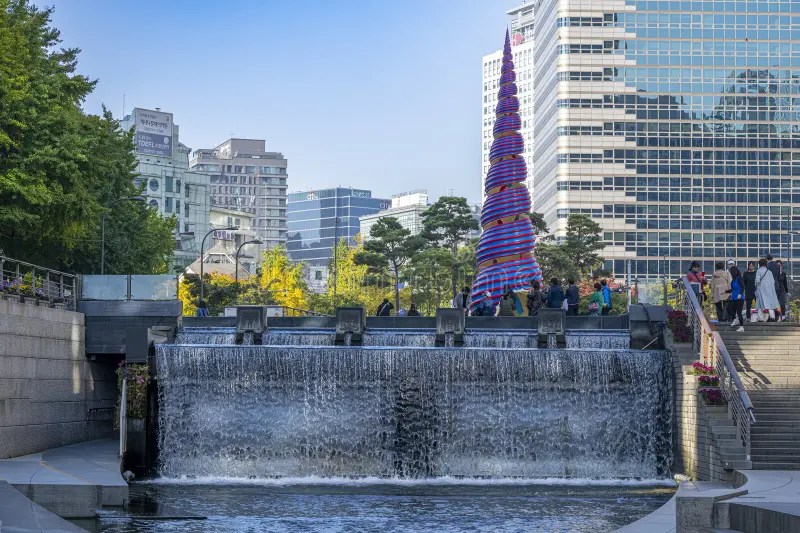 The starting point for a walk along the stream is at Cheonggye Plaza, which is near city’s historic heart, Gwanghwamun Square. It is marked by the colorful “Spring” sculpture.